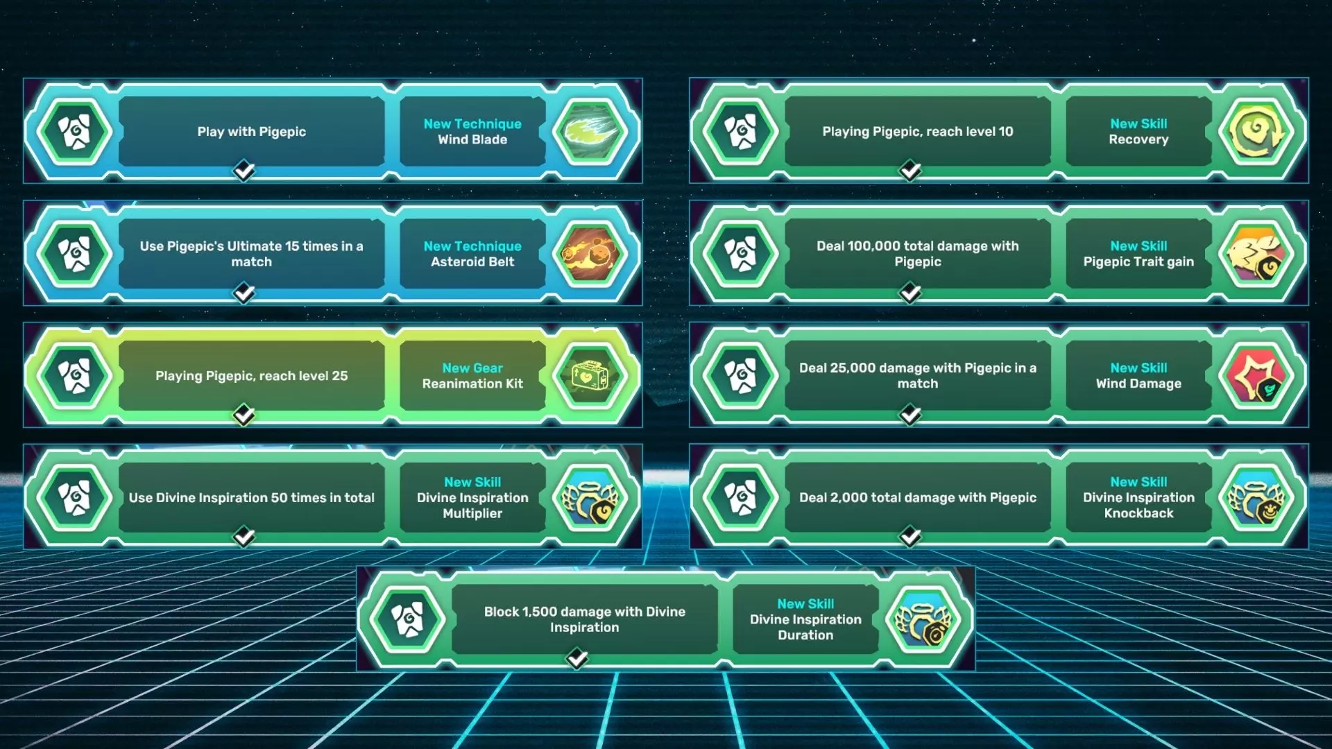 名称 描述 风刃 和皮格皮克一起游玩。 小行星带 在一场对战中使用皮格皮克的终极技能15次。 复活套件 使用皮格皮克达到25级。 神圣灵感倍增器 累计使用神圣灵感50次。 恢复 使用皮格皮克达到10级。 皮格皮克特性获取 用皮格皮克造成总计100,000点伤害。 风属性伤害 在一场对战中用皮格皮克造成25,000点伤害。 神圣灵感击退 用皮格皮克造成总计2,000点伤害。 神圣灵感持续时间 用神圣灵感格挡1,500点伤害。 奥里