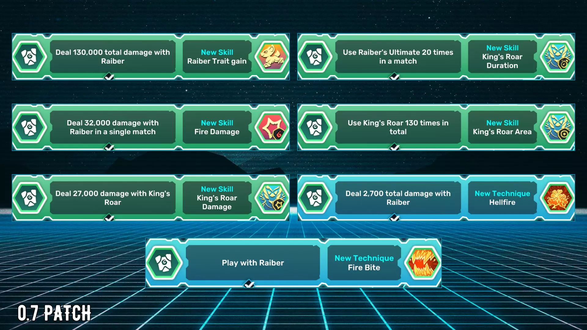 名称描述 雷柏特性获取:使用雷柏造成总计130,000点伤害。 火焰伤害:在单场对战中使用雷柏造成32,000点伤害。 王者咆哮伤害:使用王者咆哮造成27,000点伤害。 王者咆哮持续时间:在单场对战中使用雷柏的终极技能20次。 王者咆哮范围:总计使用王者咆哮130次。 地狱之火:使用雷柏造成总计2,700点伤害。 火焰撕咬:使用雷柏进行对战。 类型 - 第一部分 普通
