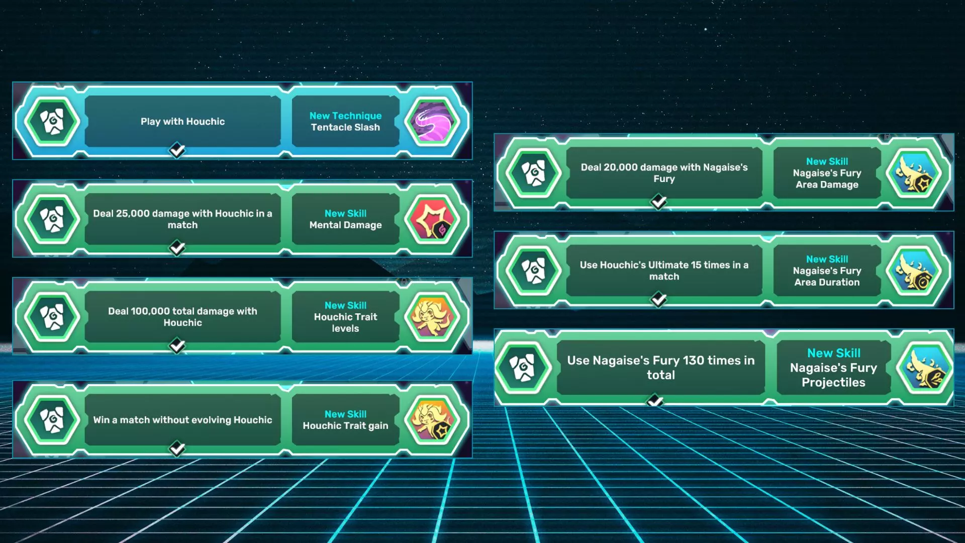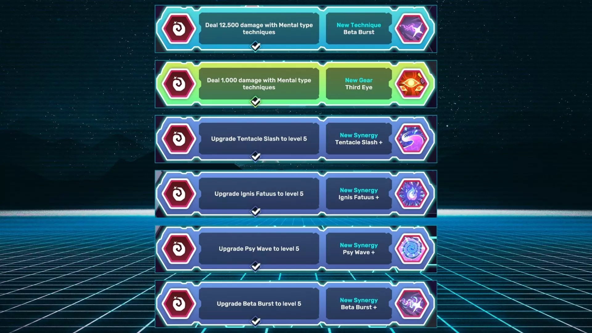 Beta Burst:使用精神系技能造成12500点伤害。 Third Eye:使用精神系技能造成1000点伤害。 Tentacle Slash +:将触手斩升级至5级。 Ignis Fatuus +:将鬼火升级至5级。 Psy Wave +:将精神波动升级至5级。 Beta Burst +:将贝塔爆发升级至5级。 自然