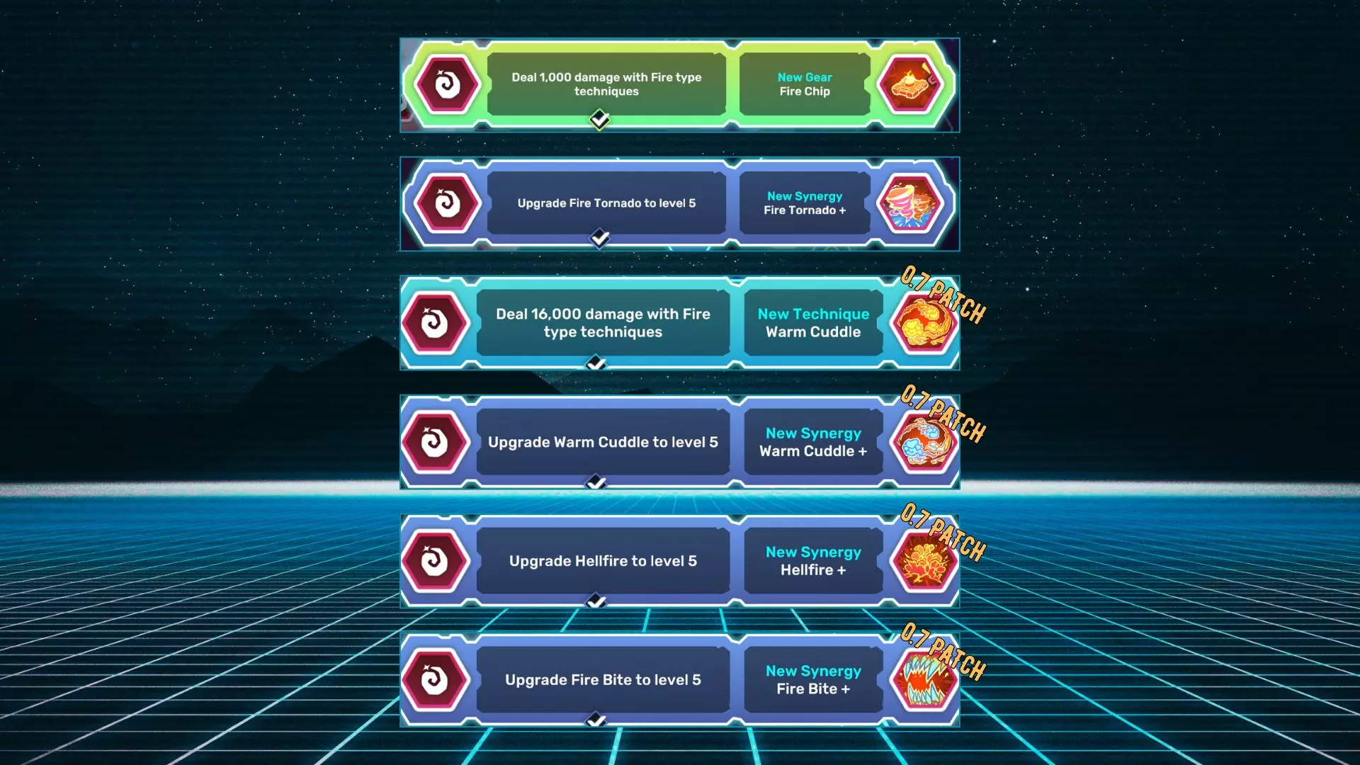火之芯片:使用火系技能造成1000点伤害。 火焰龙卷风+:将火焰龙卷风升级至5级。 温暖拥抱:使用火系技能造成16000点伤害。 温暖拥抱+:将温暖拥抱升级至5级。 地狱之火+:将地狱之火升级至5级。 火焰撕咬+:将火焰撕咬升级至5级。 剧毒