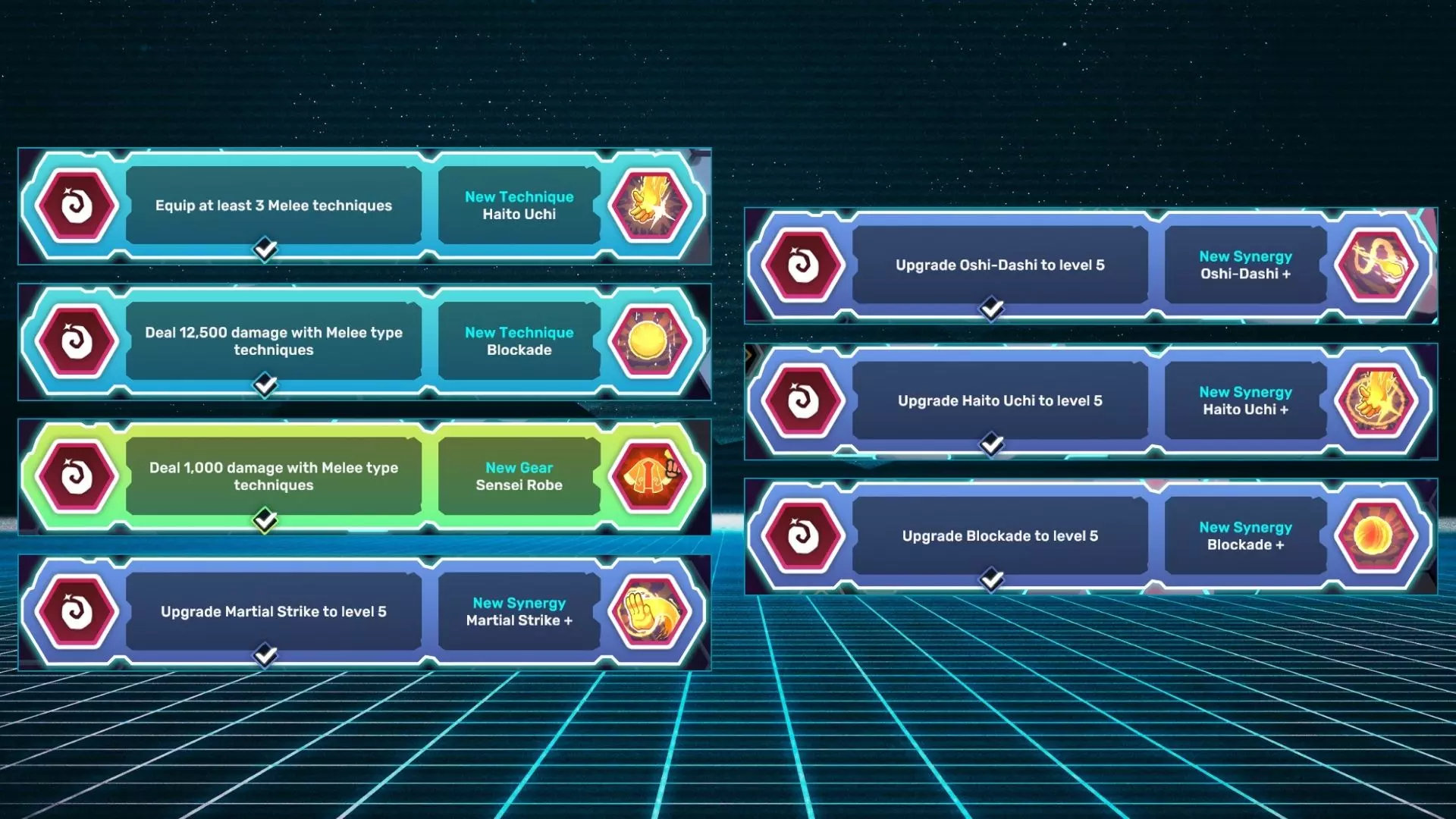 名称 描述 破击掌 装备至少3种近战技能。 封锁 用近战类型技能造成12500点伤害。 师范道袍 用近战类型技能造成1000点伤害。 martial strike + 将martial strike升级至5级。 oshi-dashi + 将oshi-dashi升级至5级。 破击掌 + 将破击掌升级至5级。 封锁 + 将封锁升级至5级。 精神