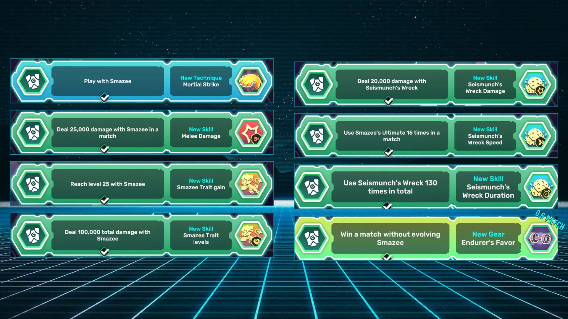 名称描述 格斗冲击 使用斯马兹进行游戏。 近战伤害 在一场对战中使用斯马兹造成25,000点伤害。 斯马兹特性获取 使斯马兹达到25级。 斯马兹特性等级 累计使用斯马兹造成100,000点伤害。 地震粉碎伤害 使用地震粉碎造成20,000点伤害。 地震粉碎速度 在一场对战中使用斯马兹的终极技能15次。 地震粉碎持续 使用地震粉碎累计100次。 坚韧者的恩赐 不进化斯马兹赢得一场对战。 水晶兽