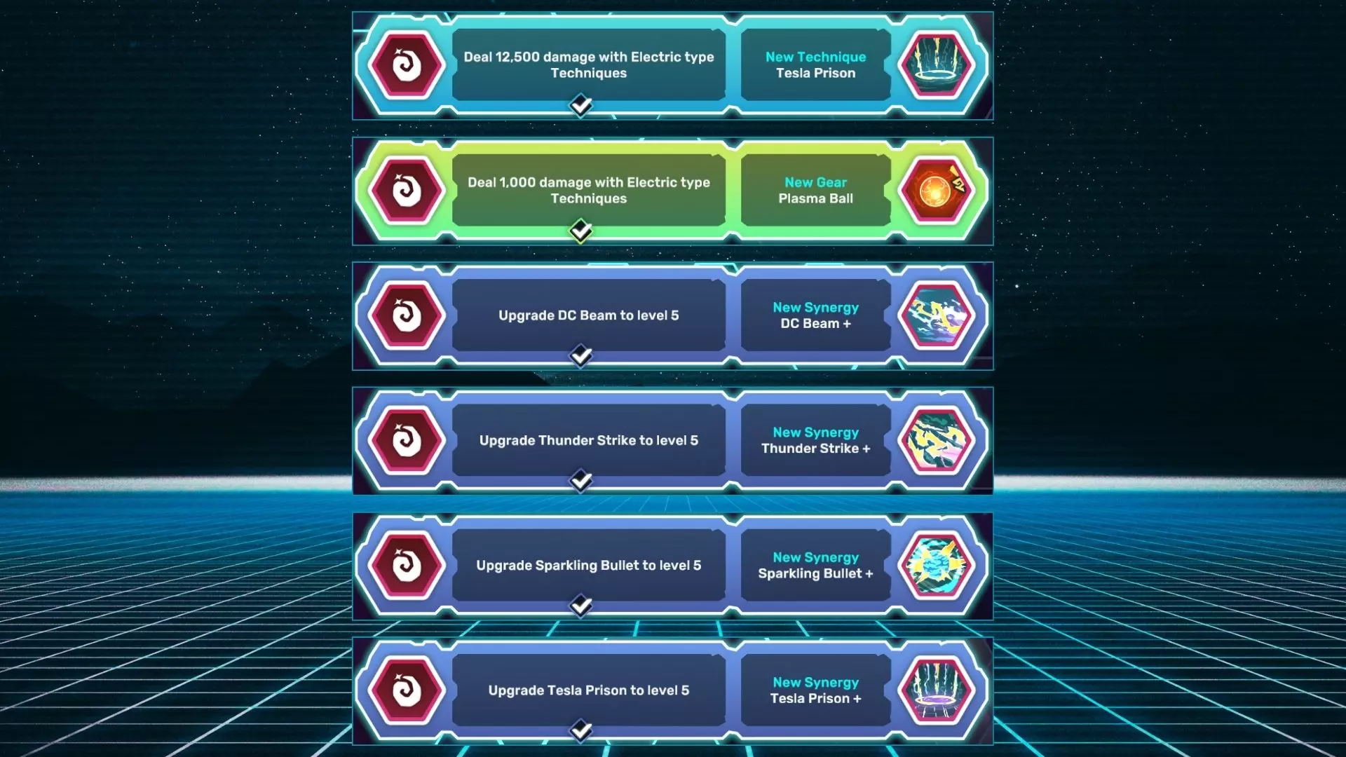 名称 描述 特斯拉监狱 用电气属性技能造成12500点伤害。 等离子球 用电气属性技能造成1000点伤害。 直流电束+ 将直流电束升级至5级。 雷击+ 将雷击升级至5级。 闪光弹+ 将闪光弹升级至5级。 特斯拉监狱+ 将特斯拉监狱升级至5级。 水