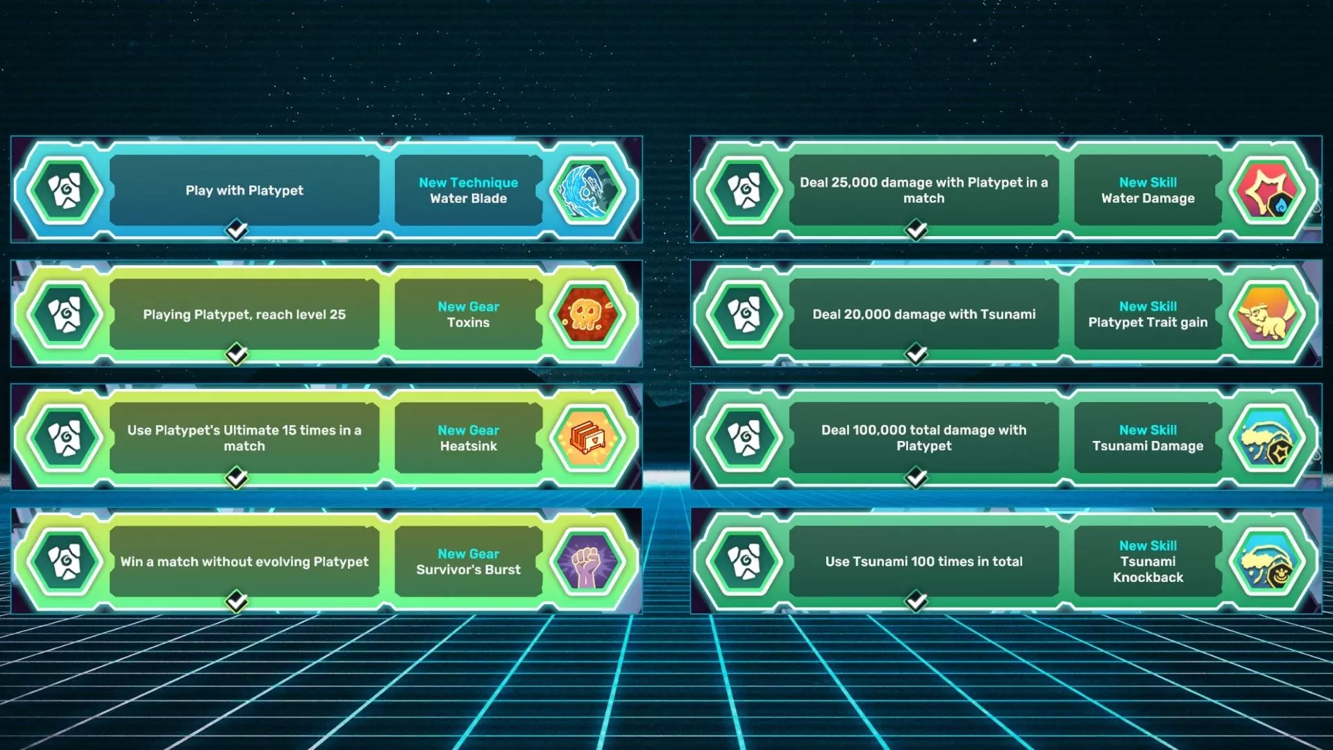 水刃:使用鸭嘴兽腾兽进行游戏。 毒素:使用鸭嘴兽腾兽达到25级。 散热片:在一场对战中使用鸭嘴兽腾兽的终极技能15次。 幸存者的爆发:不进化鸭嘴兽腾兽赢得一场对战。 水之伤害:在一场对战中用鸭嘴兽腾兽造成25,000点伤害。 鸭嘴兽腾兽特性获取:用海啸造成20,000点伤害。 海啸伤害:用鸭嘴兽腾兽累计造成100,000点伤害。 海啸击退:累计使用海啸100次。 胡奇克
