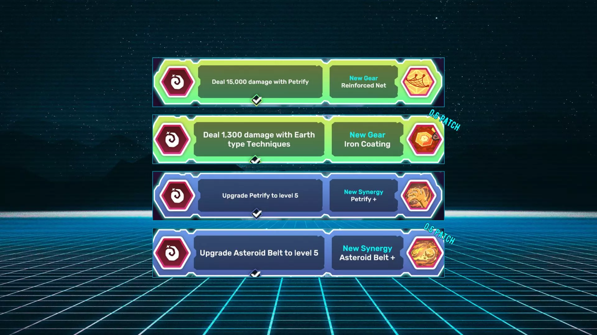 名称 描述 强化网 使用【石化】造成15,000点伤害。 钢铁涂层 使用土系技能造成1,300点伤害。 石化+ 将【石化】升级至5级。 小行星带+ 将【小行星带】升级至5级。 数字