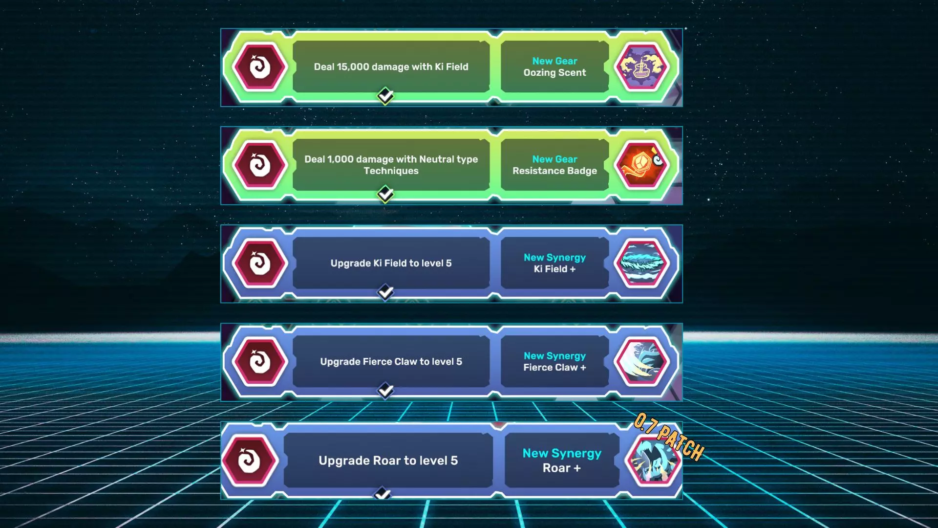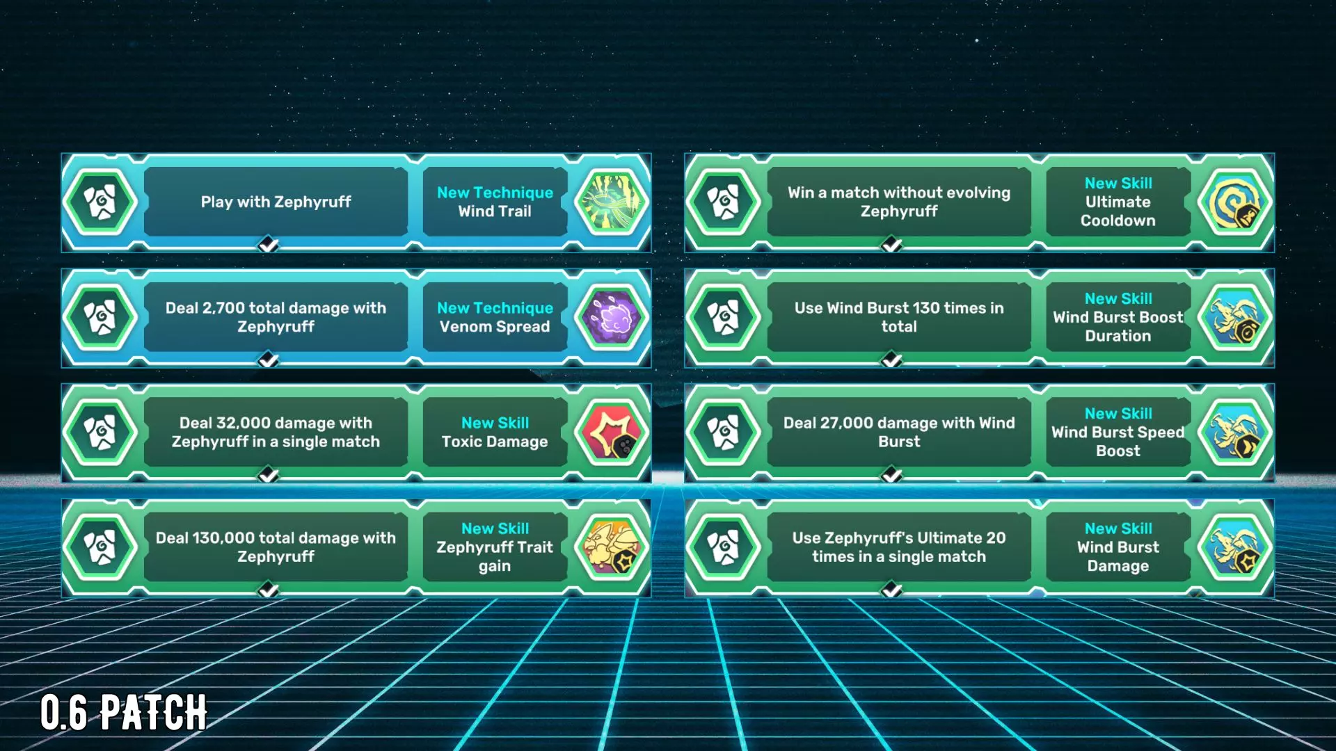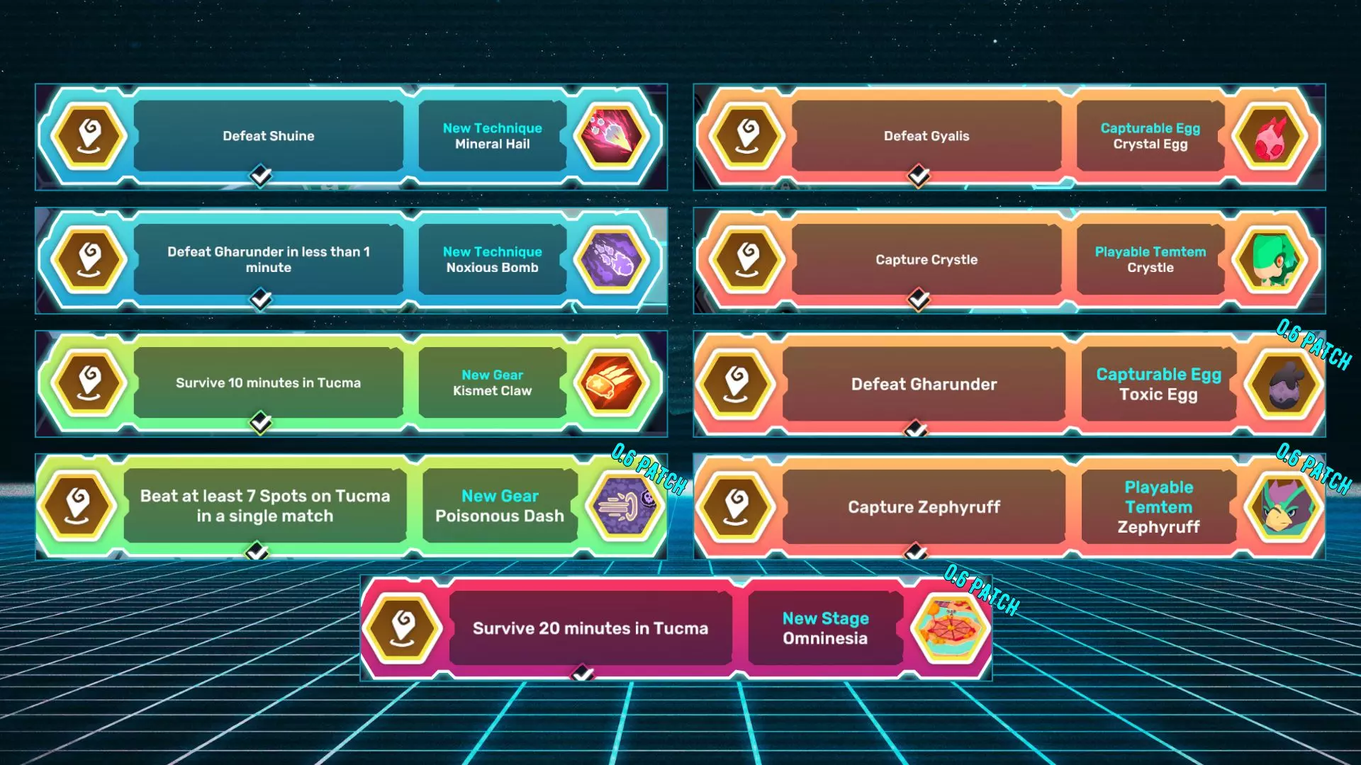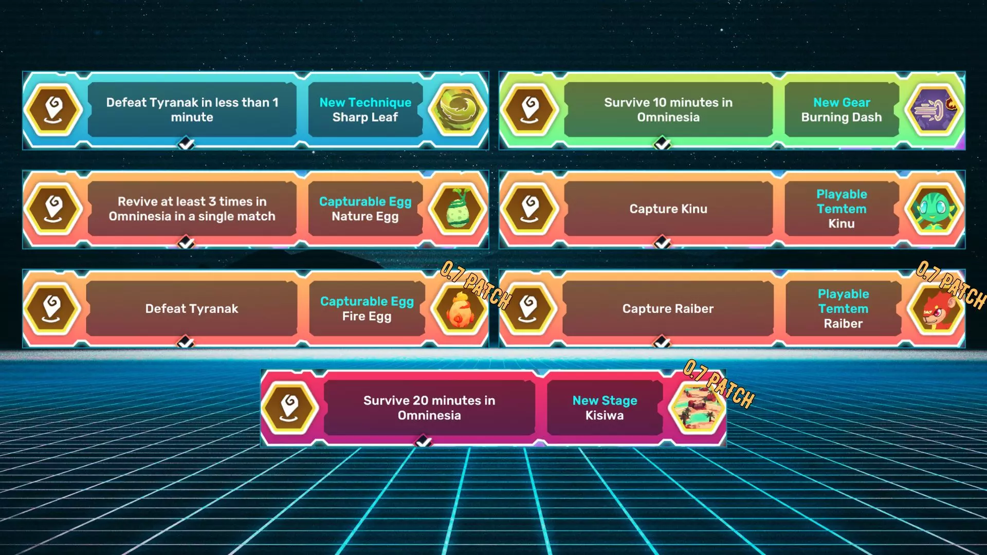 名称 描述 锋利叶片 1分钟内击败泰拉纳克 燃烧冲刺 在奥姆尼西亚存活10分钟 自然之卵 单场比赛中在奥姆尼西亚至少复活3次 奇努 捕获奇努 火焰之卵 击败泰拉纳克 莱伯 捕获莱伯 基西瓦 在奥姆尼西亚存活20分钟 基西瓦