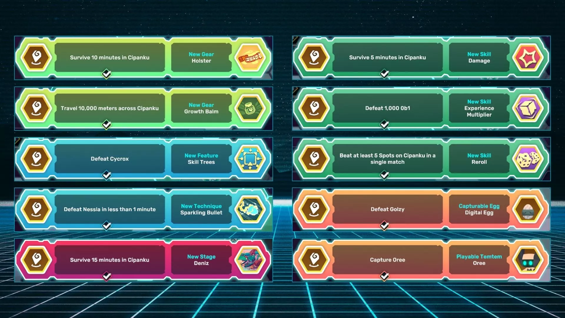名称 描述 Holster 在希潘库生存10分钟。 Growth Balm 穿越希潘库10,000米。 Skill Trees 击败赛克罗克斯。 Sparkling Bullet 在1分钟内击败尼斯拉。 Deniz 在希潘库生存15分钟。 Damage 在希潘库生存5分钟。 Experience Multiplier 击败1000只0b1。 Reroll 在单场比赛中至少击败希潘库的5个地点。 Digital Egg 击败戈尔兹。 Oree 捕捉奥里。 Deniz