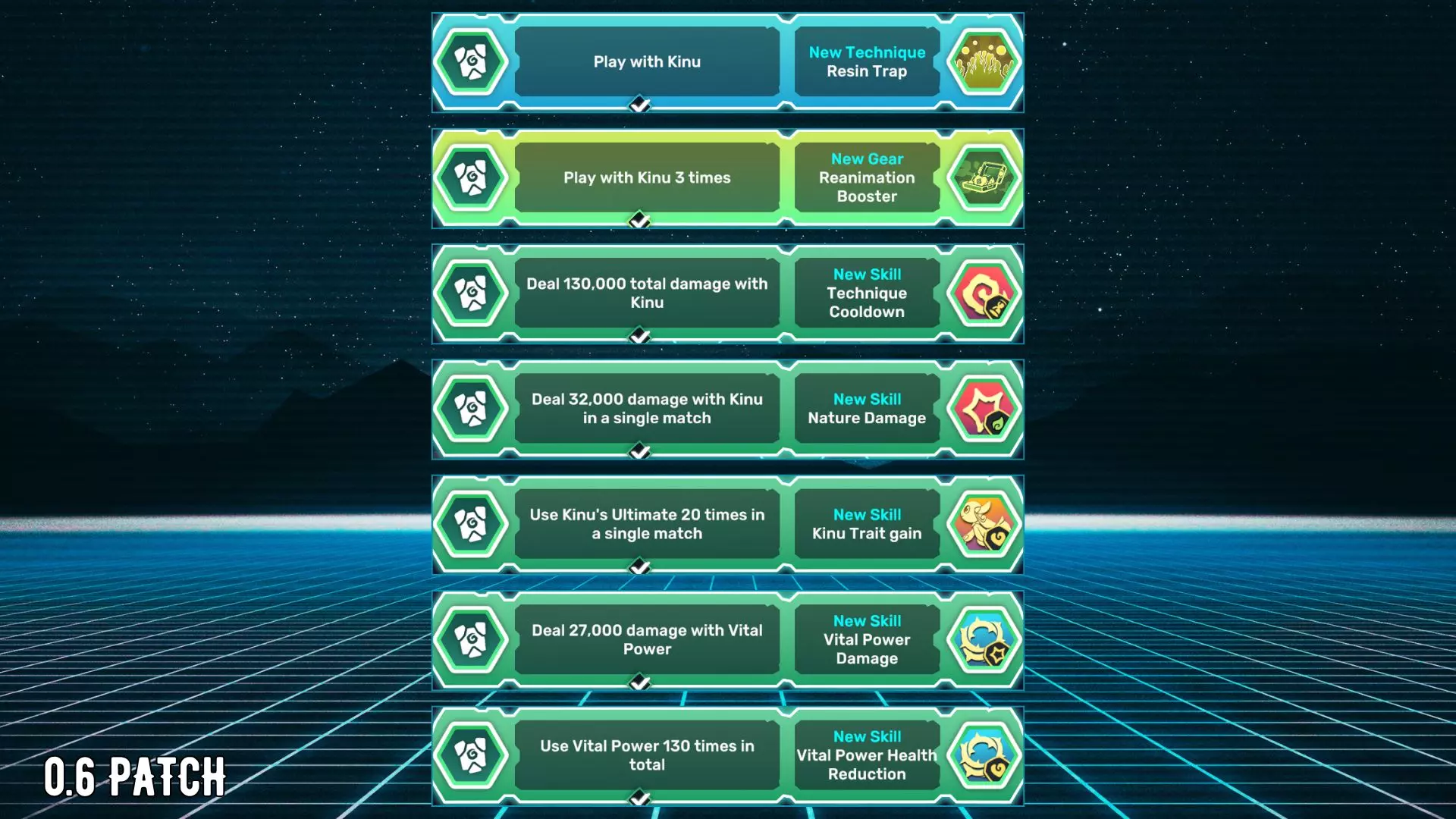 树脂陷阱:与基努一同游玩。 复活助推器:与基努一同游玩3次。 技能冷却:使用基努造成总计130,000点伤害。 自然伤害:在单场对战中使用基努造成32,000点伤害。 基努特性获取:在单场对战中使用基努的终极技能20次。 生命能量伤害:使用生命能量造成27,000点伤害。 生命能量生命值削减:总计使用生命能量130次。 雷伯