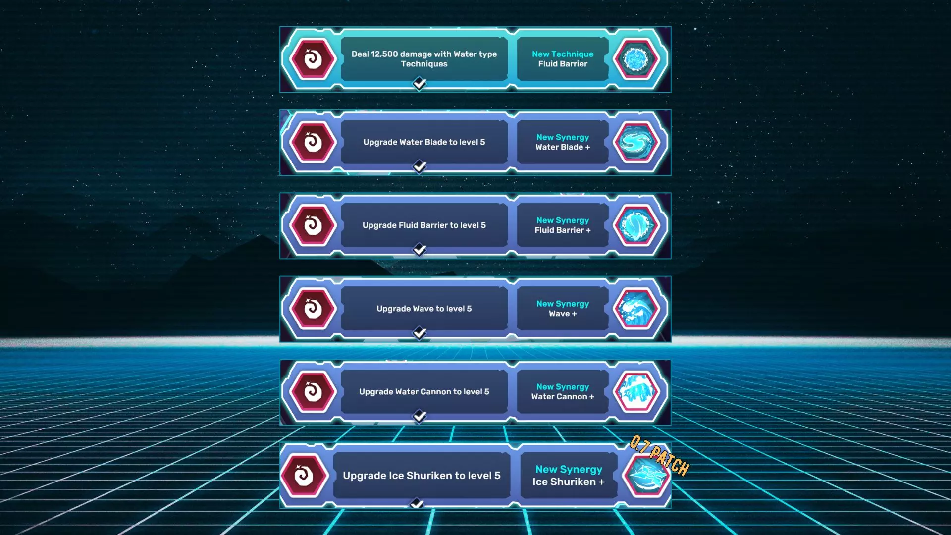 名称描述 流体屏障:使用水系技能造成12500点伤害。 水刃+:将水刃升级至5级。 波浪+:将波浪升级至5级。 水炮+:将水炮升级至5级。 流体屏障+:将流体屏障升级至5级。 冰手里剑+:将冰手里剑升级至5级。 属性 - 第二部分 水晶
