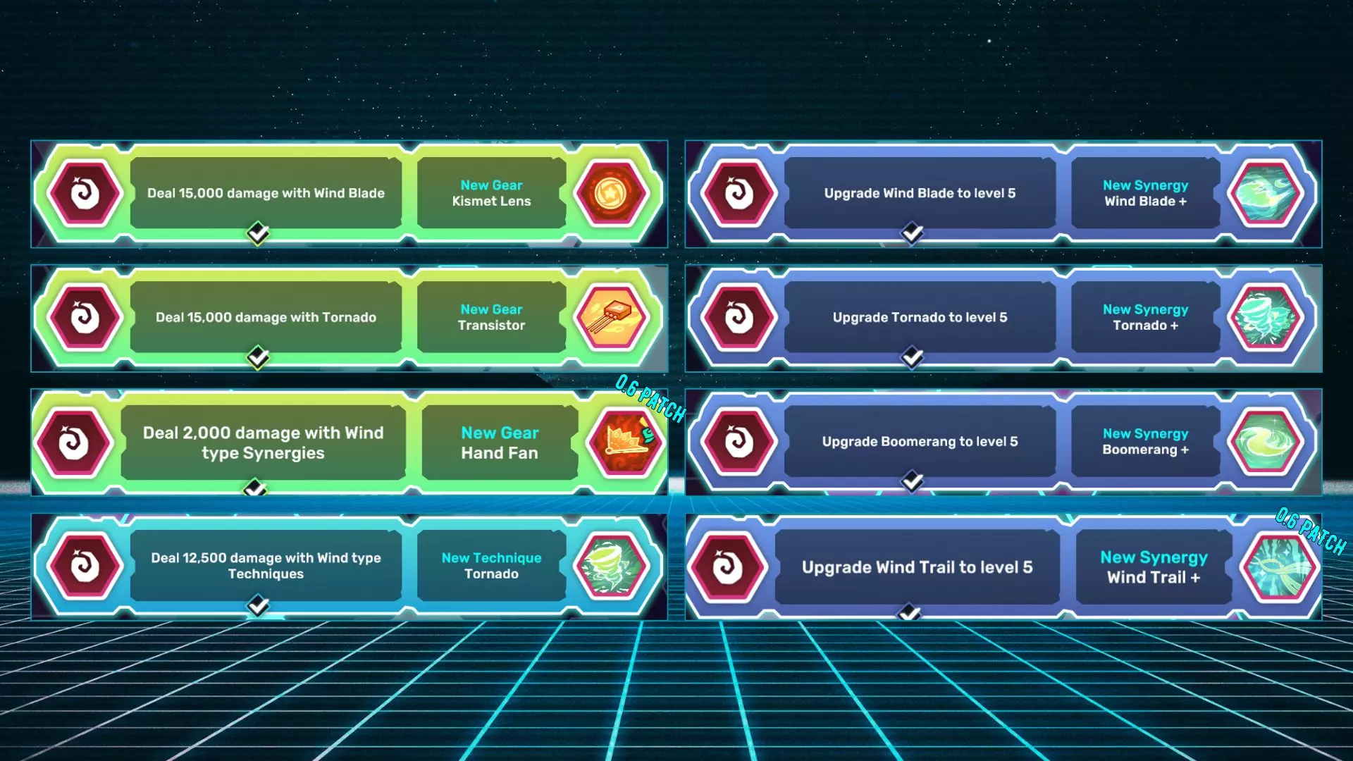 名称 描述 龙卷风 用风属性技能造成12500点伤害。 晶体管 用龙卷风造成15000点伤害。 折扇 用风属性协同技能造成2000点伤害。 命运透镜 用风刃造成15000点伤害。 风刃+ 将风刃升级至5级。 回旋镖+ 将回旋镖升级至5级。 龙卷风+ 将龙卷风升级至5级。 风之轨迹+ 将风之轨迹升级至5级。 大地