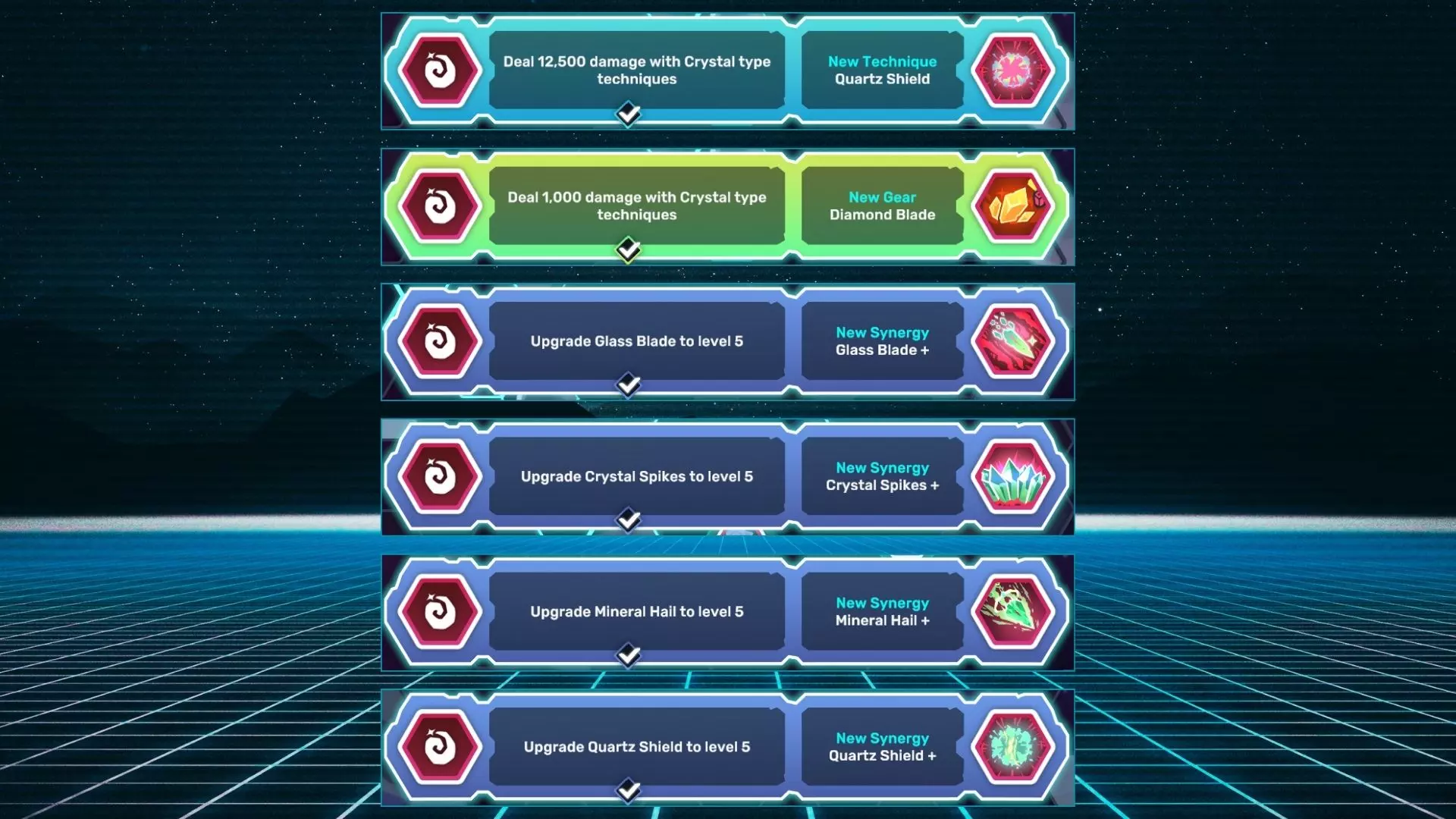 水晶护盾:使用水晶系技能造成12500点伤害。 钻石之刃:使用水晶系技能造成1000点伤害。 玻璃之刃+:将玻璃之刃升级至5级。 水晶尖刺+:将水晶尖刺升级至5级。 矿物冰雹+:将矿物冰雹升级至5级。 石英护盾+:将石英护盾升级至5级。 火焰