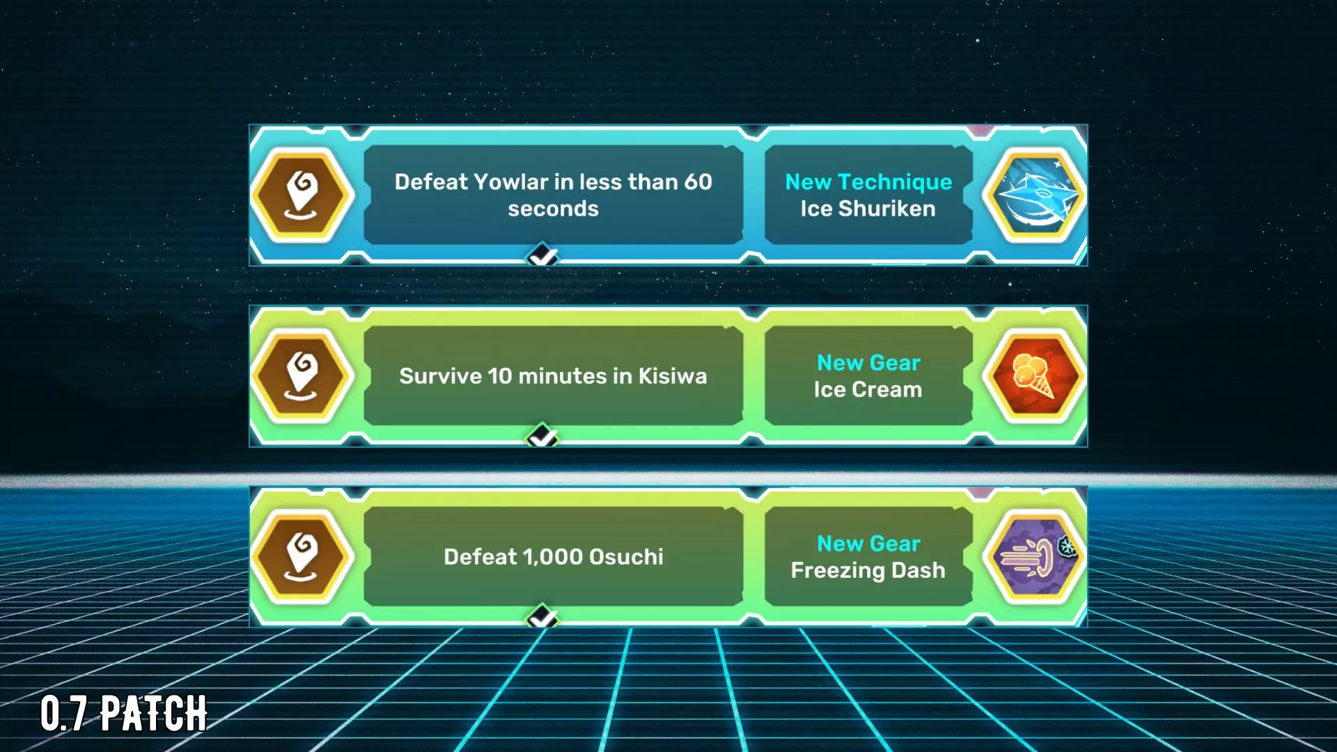 冰手里剑:在60秒内击败Yowlar。 冰淇淋:在基西瓦生存10分钟。 冰冻冲刺:击败1000只Osuchi。