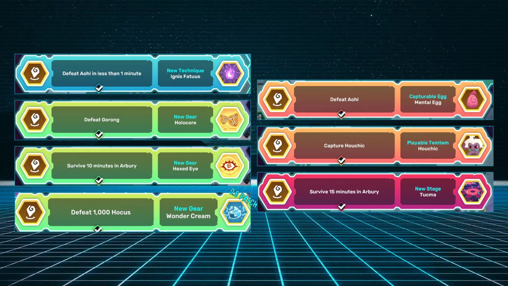 Hexed Eye:在阿伯里存活10分钟。 Holocore:击败戈龙。 Mental Egg:击败阿希。 Houchic:捕捉胡奇克。 Ignis Fatuus:在1分钟内击败阿希。 Tucma:在阿伯里存活15分钟。 Tucma