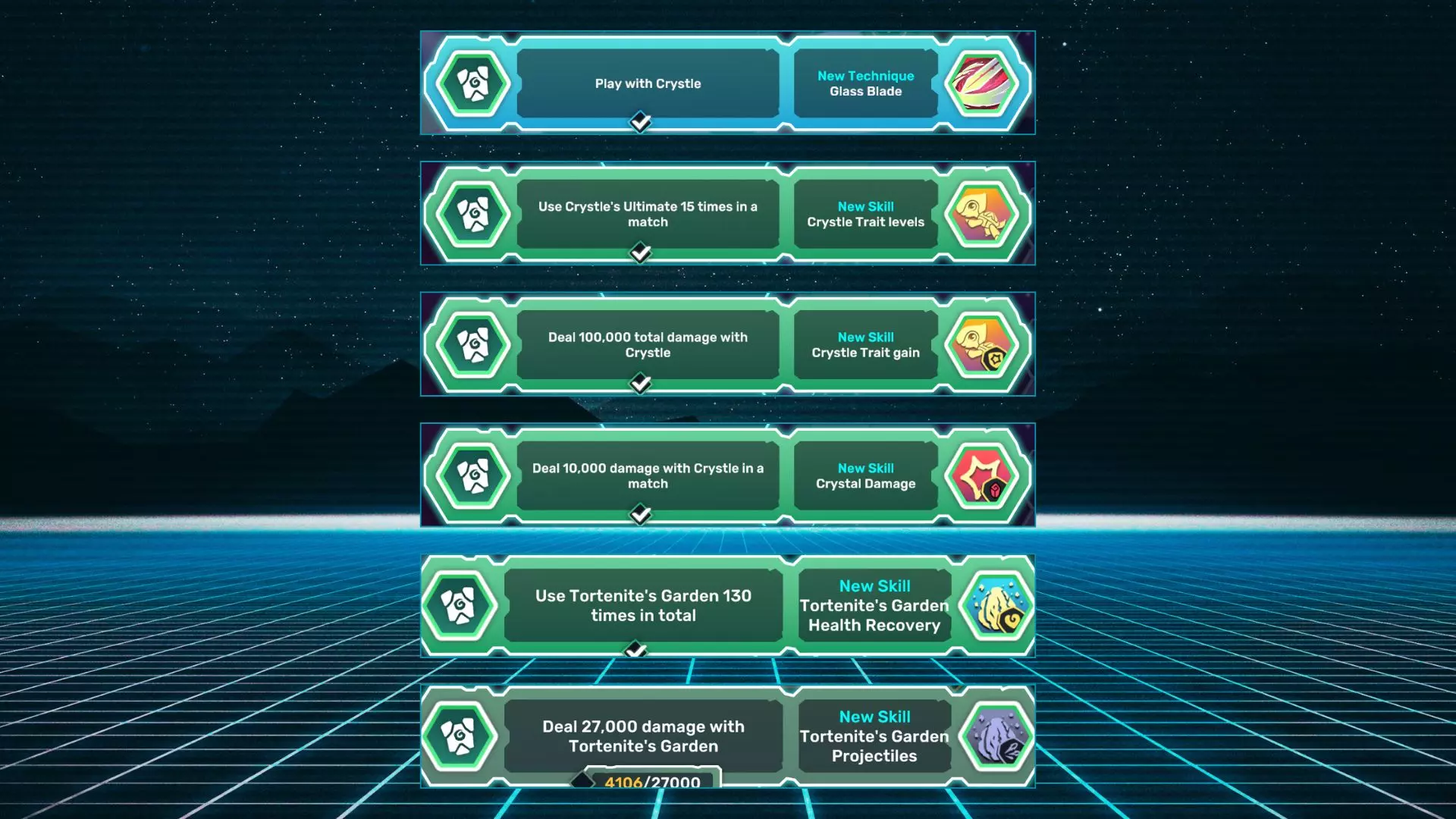 玻璃之刃:使用水晶腾兽进行游戏。 水晶腾兽特性等级:在一场对战中使用水晶腾兽的终极技能15次。 水晶腾兽特性获取:使用水晶腾兽造成总计100,000点伤害。 水晶伤害:在一场对战中使用水晶腾兽造成10,000点伤害。 托藤尼特花园生命值恢复:累计使用托藤尼特花园130次。 托藤尼特花园投射物:使用托藤尼特花园造成27,000点伤害。 西风犬