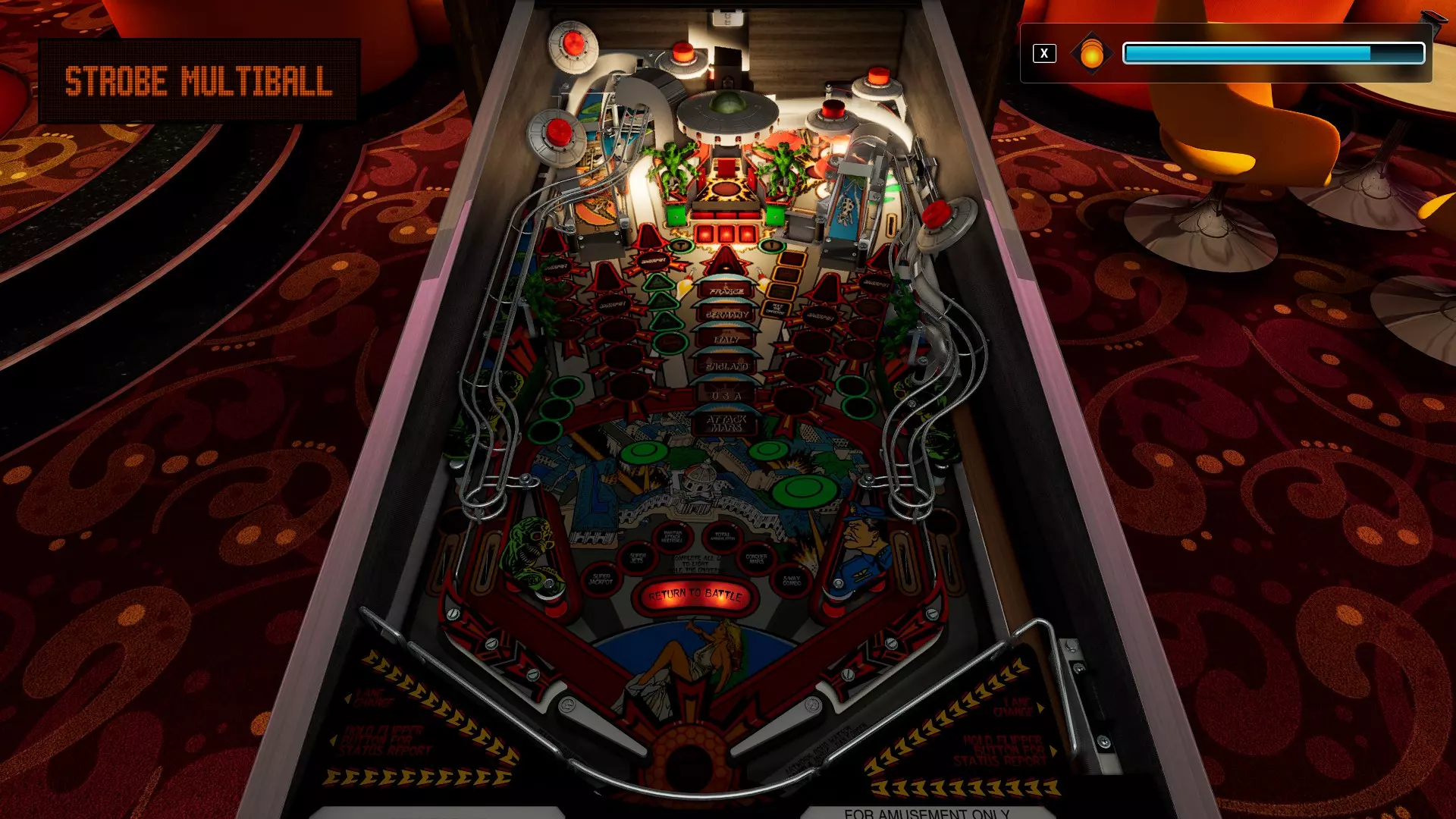 《Pinball FX》的光照效果已升级,能够更充分地展现各种光照特性,而【频闪多球模式】在此更能体现真实闪光灯的工作方式。它所照亮的区域远超表面的任何物体,甚至可能延伸到后玻璃区域。 FX虚幻引擎,1080p,高TAA(MBeeching修改设置):