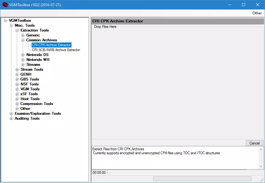 打开它并创建一个新文件夹(我将其命名为“文件替换”)。在该文件夹内新建一个名为Mod.ini的ini文件,并将以下内容粘贴进去: [Main] IncludeDir0="." IncludeDirCount=1 [Desc] Title="File Swapping" Description="此模组用于通过替换文件来更改语言。" Version="1.0" (标题应重命名为与目录相同的名称) 保存文件后,还要创建一个名为“disk”的新文件夹,并在其中再创建一个名为“sonic2013_patch_0”的文件夹。 现在我们需要提取游戏文件,解压vgmtoolbox并打开可执行文件,选择Misc.Tools->Extraction Tools->Common Archives->Cri Cpk Archive Extractor。