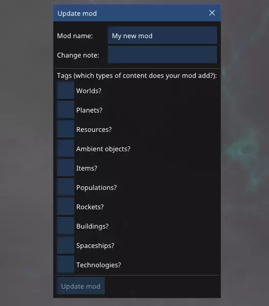 更新你的模组 每次修改模组后,你都需要将其上传至Steam。编辑器会通过上传模组目录内的所有文件来帮你完成这一操作。你可以通过之前提到的【模组】选项卡中的【更新模组...】按钮来更新模组。点击该按钮后会打开另一个弹窗。
