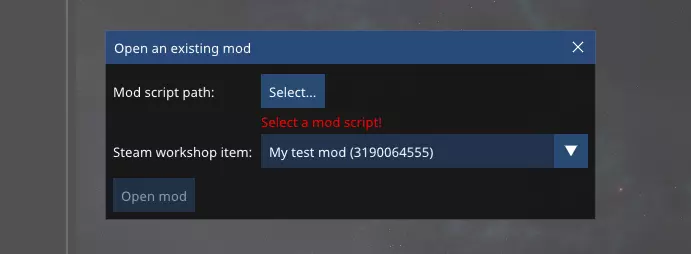编辑现有模组 要编辑现有模组,首先需确保你拥有模组文件。作为模组的创建者,你的电脑上通常会有这些文件。如果不慎丢失,你需要在Steam创意工坊订阅该模组,并将文件复制到游戏安装目录中它们最初创建的位置。 如果你已拥有文件,启动编辑器并在欢迎弹窗中点击【打开现有模组】。在此步骤中,你需要选择要编辑的模组的模组脚本。在【Steam创意工坊项目】下拉框中,选择正确的工坊项目。该下拉框包含你所有拥有的Planet S创意工坊项目,你可以通过名称或唯一的工坊项目ID来识别它们。你可以将其与相应创意工坊项目的Steam页面网址中的数字进行比较。