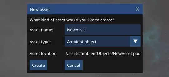 在其中你可以编辑Steam创意工坊中显示的模组标题,并输入更新说明。这里也是你设置模组标签的地方。这些标签与我们为【Planet S】创意工坊配置的分类相对应。理想情况下,它们应能说明你的模组添加了哪些内容类型。 点击【更新模组】会开始向Steam后台上传。上传时间可能需要几秒钟,具体取决于你的网络连接速度。上传完成后,编辑器右下角会显示成功通知。在此之前不要关闭编辑器,以防止出现问题! 编辑资源 除了创建和更新创意工坊项目外,编辑器的主要用途是创建和编辑【Planet S】的资源。虽然纹理、模型和声音需要在其他地方创建,但编辑器是用于创建【Planet S】资源的工具。这些资源包括: 环境物体(星球装饰) 资源(如黏土或铁矿等资源矿床) 建筑 宇宙飞船 粒子类型 纹理包 你可以同时打开多个不同的资源。要创建资源,请点击“文件...”,然后点击“新建...”。此时会弹出“新建资源”窗口。
