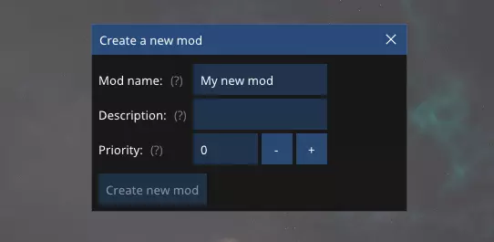 随后会弹出一个新窗口,要求你输入模组名称、简短描述文本以及优先级。 模组名称将作为游戏内的模组名称,同时也会作为Steam创意工坊中的标题。如果之后想要更改,你需要在模组脚本中编辑游戏内名称,并在Steam中修改创意工坊项目标题。 描述文本仅在游戏内使用。优先级将作为模组资源文件夹的优先级,你可以将其保留为默认值0。这两个数值之后都可以在生成的文件中进行编辑。