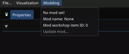 填写文本字段并点击“创建新模组”后,模组将被创建。生成的文件会位于游戏安装目录的mods文件夹中,其中会有一个与你为模组输入的名称相同的子文件夹。在该子文件夹内,你会找到“assets.json”以及模组脚本,如第1章“模组文件”中所述。模组脚本也会以模组名称命名,且是一个“.lua”文件。打开该文件,你会看到预生成的“registerMod”函数。我们使用“Visual Studio Code”来编辑lua文件,该软件可免费获取。 需要注意的是,你可以查看编辑器当前“附加”的是哪个模组。点击顶部的“模组”选项卡,即可显示当前状态。如果设置了模组,你将看到其标题和唯一的创意工坊项目ID。创建(或打开)模组后,界面应如下所示: