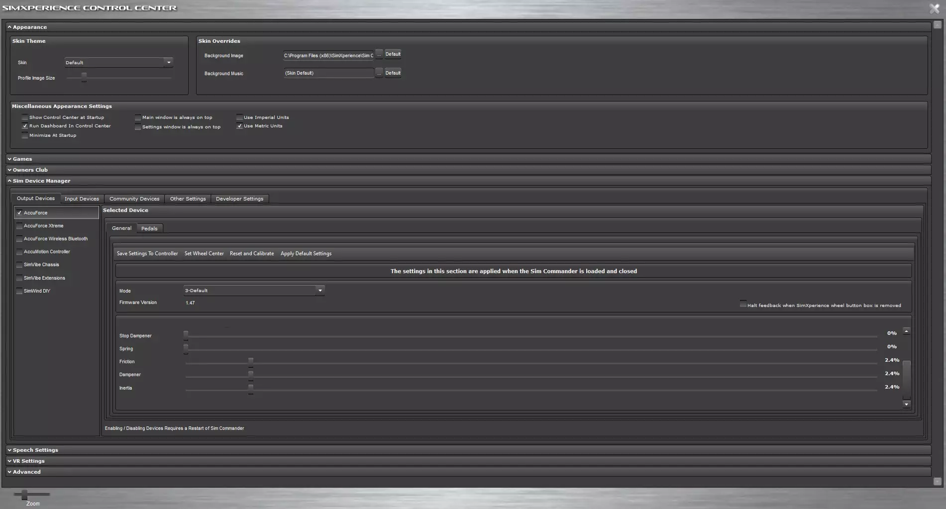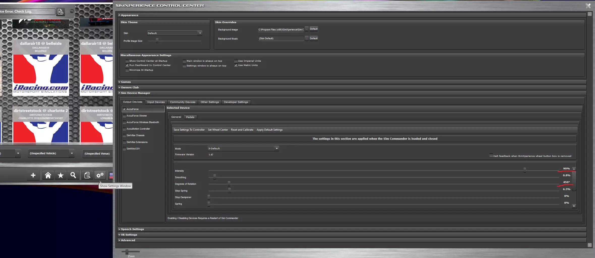 SimXperience Accuforce方向盘设置 Sim Commander设置 以下指南基于Accuforce V1方向盘制作,但同样适用于V2方向盘。V2方向盘功率较低,你可能需要提高整体力反馈强度。 无需为WRC世代创建Sim Setup配置文件。 1.打开Sim Commander并点击显示设置窗口。 2.导航至模拟设备管理器>输出设备>Accuforce