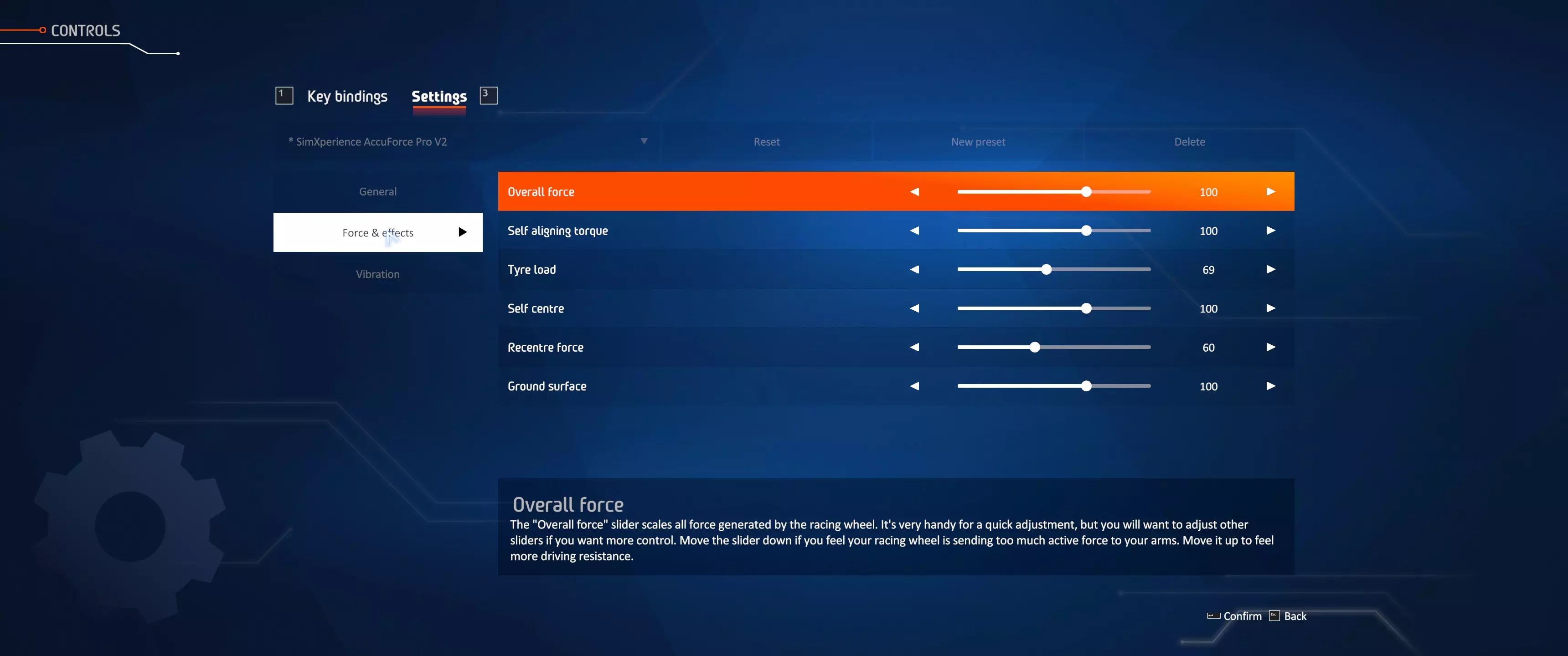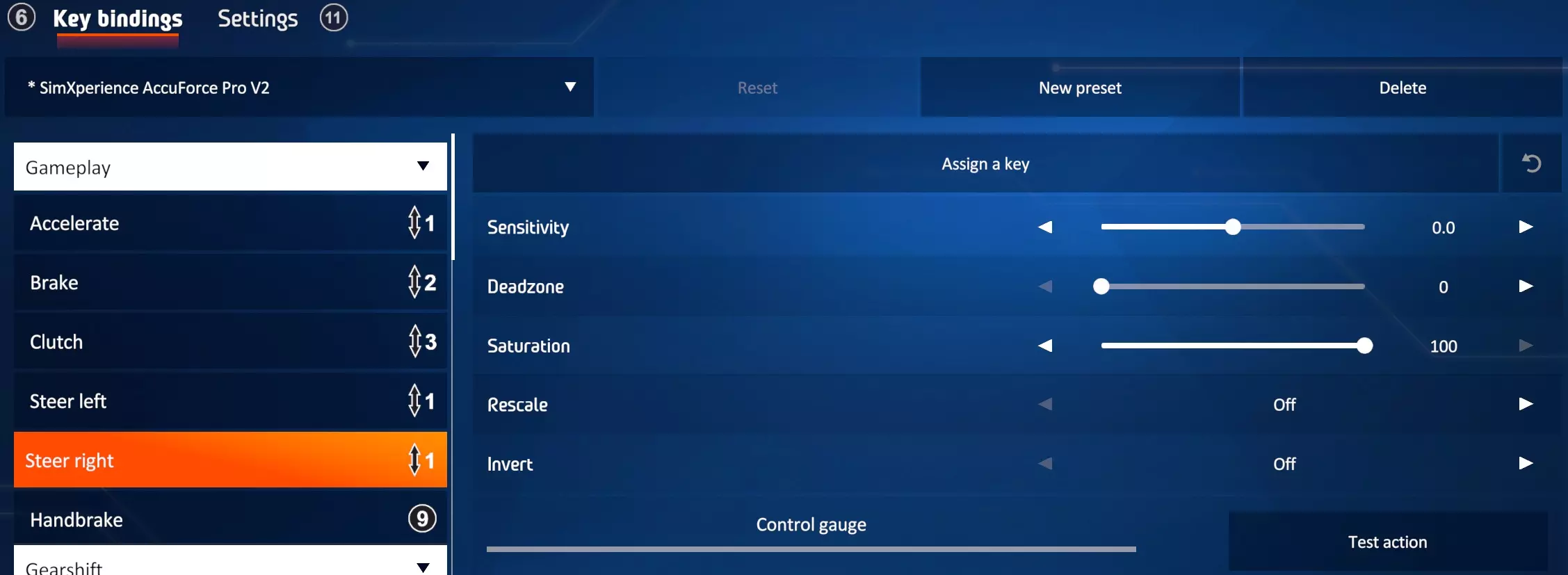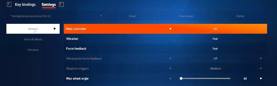 点击保存。 游戏设置 启动游戏并进入选项与控制。选择你的SimXperience Accuforce方向盘 绑定设置: