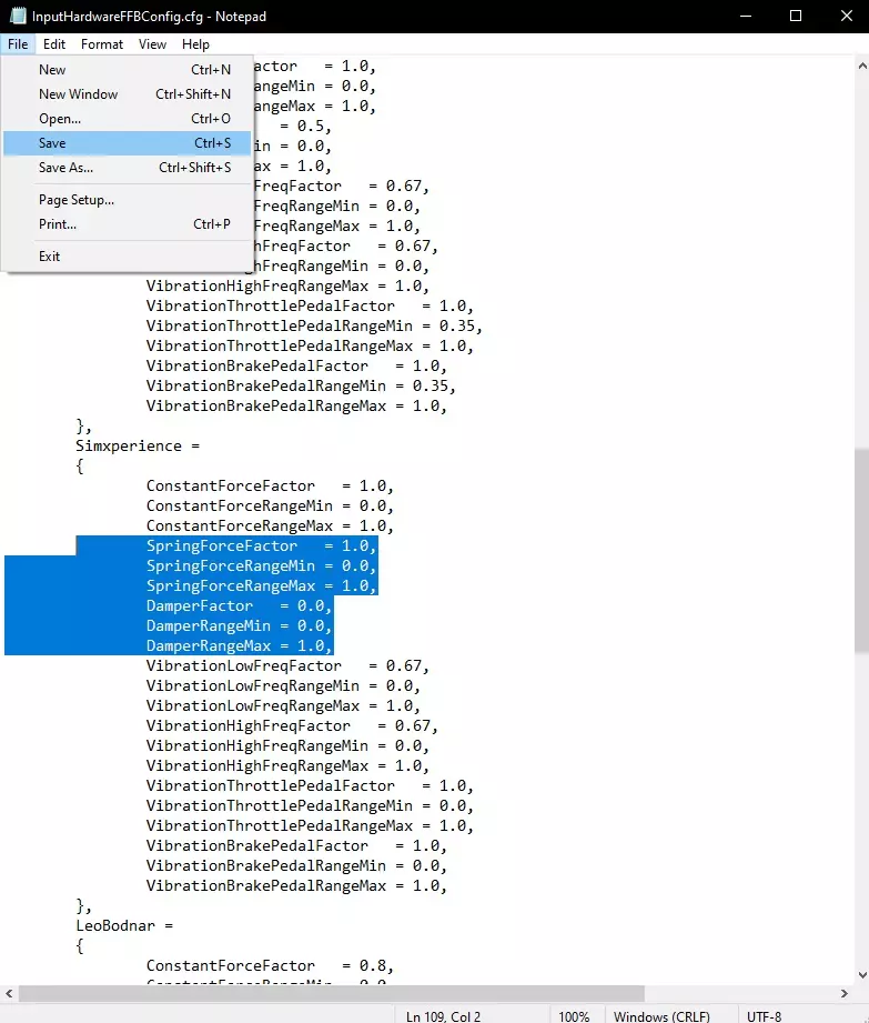 2. 点击【本地文件】,然后点击【浏览本地文件】。 3. 导航至【Common】>【Settings】文件夹,用记事本打开【InputHardwareFFBConfig.cfg】文件。 4. 在记事本中点击【文件】>【另存为】,重命名文件并保存以创建备份。 5. 重新打开原始的【InputHardwareFFBConfig.cfg】文件。 6. 向下滚动至【Simxperience】部分,并修改以下内容: 将【SpringForceFactor】从0.4改为1.0 将【DamperFactor】从1.0改为0.0 关于【DamperFactor】的说明:设为0.0可获得最清晰的力反馈效果,但你也可以将其设置在0.0到0.5之间,以平滑部分作用力。 你的文件应如下所示: