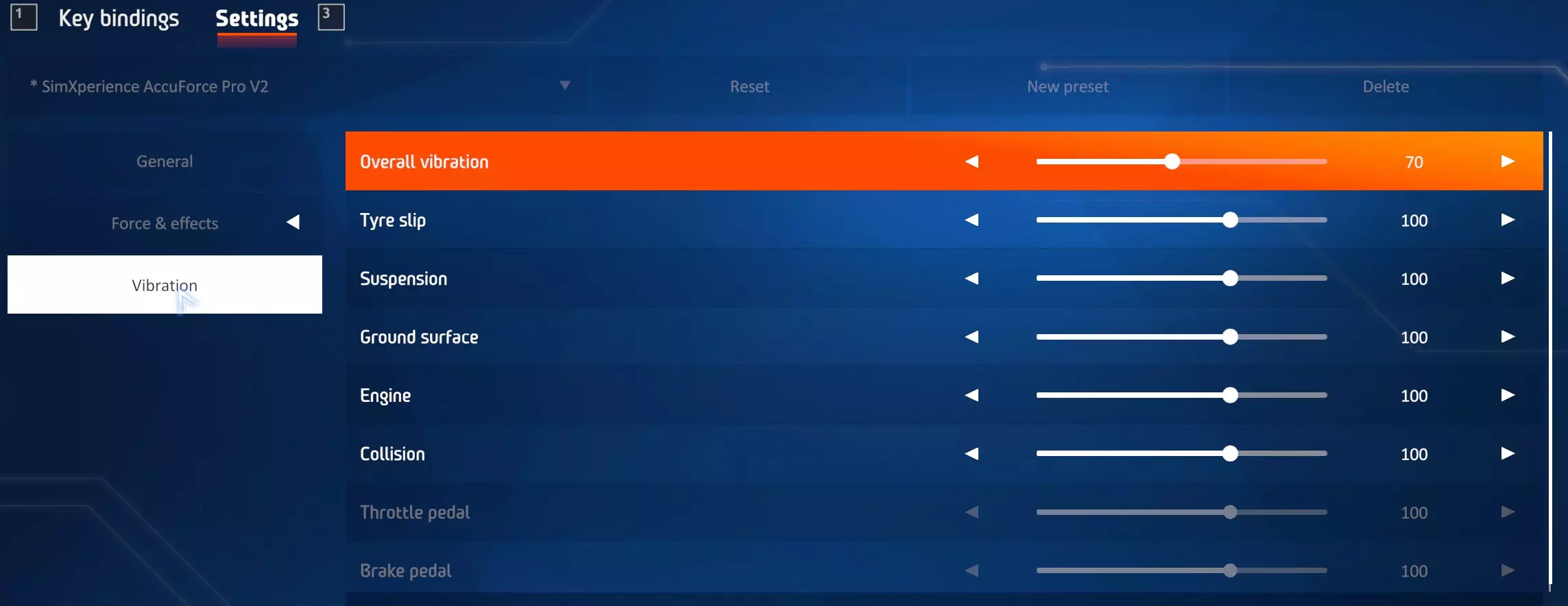 注意:这些设置是针对WRC1组别的赛车在 gravel(砂石)路面上配置的。对于 tarmac(柏油)路面,我通常会将整体反馈降低10%。 振动设置