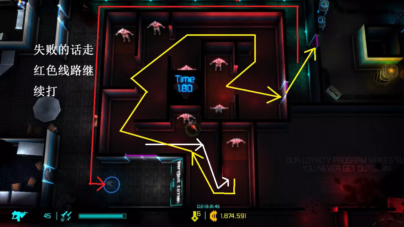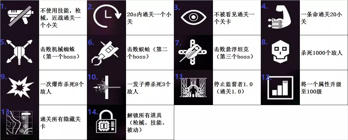 获取额外红钥匙的方法:首先找到隐藏关卡的位置,在进入隐藏关卡前拾取一把红钥匙,之后不开启红色的门直接进入隐藏关卡,通过隐藏关卡后身上就会多一把红钥匙。 S/L大法:即存档、读档大法。游戏只会在进入每一小关时或死亡时存档(进入隐藏关卡不会存档)。可以利用这个特性,在死亡前按ESC暂停,然后选择退出返回游戏界面,再次进入游戏就会重置这一小关,从而重新挑战该小关(注意不要等到角色死亡后才按ESC)。 单独完成顺序=难度=[1、2、3……](完成成就的难度仅为大致参考)(X表示具有随机性) 1、[4]与2一起完成更佳,也可以选择一个关卡,携带一把红钥匙,不进行攻击直接跑到下一关。2、被动技能携带【体格强健】、【三项全能】,角色选择黑客、刺客,这时有430多的移动速度,一样都不能少。使用S/L打法探索地图,若绿色通道不远且本身有红钥匙,读档后直接跑,中途不攻击即可完成成就1。枪械选择激光手枪会使速度更快,大约470左右。 3、这个急不来,当你打到2.0、3.0左右时,中间会有一个关卡只有一个敌人,绕过他直接通关就行。 4、这个也急不来,游戏最好从第一小关开始,中途收集未解锁道具、激活被动、升级枪械,这样才好赚钱、打怪。等被动比较好了就可以完成这个成就了 5、[1]很容易打 6、[2]同上 7、[3]同上 8、[5]同上 9、[X]用技能巨型手榴弹,携带被动【强化爆炸】、【微型爆炸】,用刺客,躲在暗处往人堆里丢技能,一次丢一个技能,很快就能完成成就(就是巨型手榴弹什么时候拿到要看运气) 10、[5]使用狙击枪,用刺客,躲在暗处瞄准,一枪打死3个敌人 11、[6]字面意思 12、[7]同上 13、[X]单纯运气 14、[X]一直带着微型导弹,隐藏关卡都进去,能比较快拿到成就 隐藏道具的拿法 1