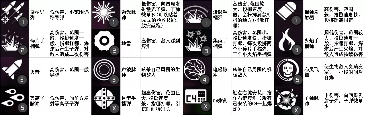我一般使用微型导弹,它可以在隐藏关卡解锁,还能追踪敌人造成伤害。激光脉冲还算可以,打BOSS时要等BOSS装弹,这时贴近BOSS狂按右键,把能量用完就跑,这种方法适合对付蜈蚣BOSS(BOSS环绕时伤害很高)。爆破手榴弹还不错,算是平均型的手榴弹。榴弹发射器不太好用,经常打不到敌人,还容易误伤自己(技术好的玩家可以随意尝试,当我没说)。碎片手榴弹能够吸引敌人注意(被子弹击中的敌人会朝手榴弹方向移动)。地雷可以用来伏击敌人和BOSS。集束手榴弹比较强,对付蜈蚣BOSS效果很好。火焰手榴弹的主要作用是让敌人燃烧,生物敌人燃烧后会乱跑(有时不会),乱跑时就不会攻击你了。火箭实用性较低,技术型玩家可以慢慢摸索,其他人建议还是别用了。声波脉冲和电磁脉冲效果尚可,但对Boss无效。心灵飞镖非常好用,不过Boss均为机械单位(发射出的飞镖会被障碍物和机械敌人阻挡,生物敌人若移动也可能导致未命中,新手需谨慎使用)。等离子脉冲还不错,在使用爆炸类型枪械时可以搭配。巨型手榴弹实用性较低,但可用于完成成就。C4非常好用,是阴人的绝佳选择,范围比地雷大,伤害更高,且能手动触发。子弹脉冲,个人感觉比激光脉冲稍逊一筹。