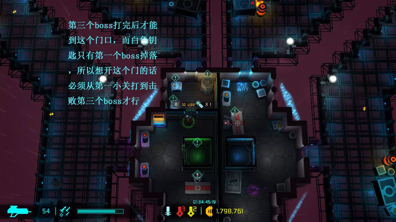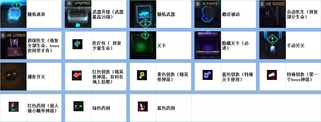 随机道具:枪械、技能、被动的右下角有一个数字标识,每个大楼层的随机道具都有概率获得相应数字标号的枪械、技能、被动(标有X的需在隐藏关卡中寻找)。当当前楼层的技能全部获得后,随机道具会随机提供一个技能,此时可选择更换技能或获取500货币;获得枪械时,新枪械会掉落在地上(武器等级与你拥有的一致);当被动全部获得后,会随机获得4个基本属性中某一项的上限提升1级,或当前等级提升1级(属性上限是无法通过货币购买的,建议选择属性而非货币)。以上内容均为概率获得,取决于运气。 武器升级:提升手中武器的等级(总枪械等级+1) 随机武器:掉落一把枪械,掉落的枪械等级为总枪械等级+1(总枪械等级也会随之+1)。 激活被动:获得一个新的被动,被动栏满时可替换掉不好用的被动,也可以选择不替换。 通道:通过绿色通道进入下一关,通过紫色通道进入隐藏关卡(进入隐藏关卡不会触发通过小关的被动【佣金】②和【战斗准备】①)。 开关:手动开关按E键使用,爆炸开关通过攻击触发。 钥匙:红色钥匙用于打开绿色通道前的红门,黄色钥匙用于打开内部物品随机的黄门,蓝色钥匙用于打开隐藏关卡内绿色通道前的门,白色钥匙用于打开第三个BOSS房间内的门(解锁隐藏道具)。 药剂:红色药剂使用后可对范围内敌人造成伤害并治疗自身,因此适合冲入敌群混战;蓝色药剂用于回复能量,建议在拾取蓝色药剂前先耗尽当前能量;绿色药剂能增强枪械伤害,使子弹具备穿墙能力并可攻击多个敌人。