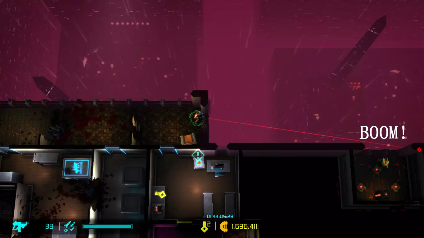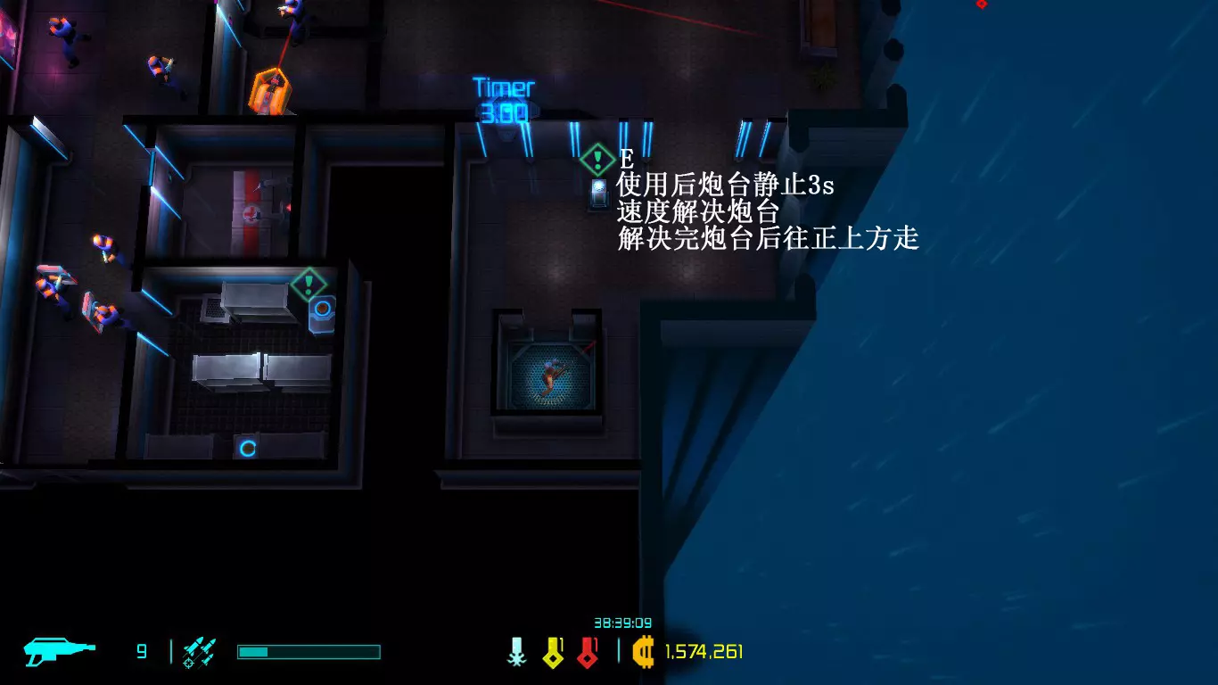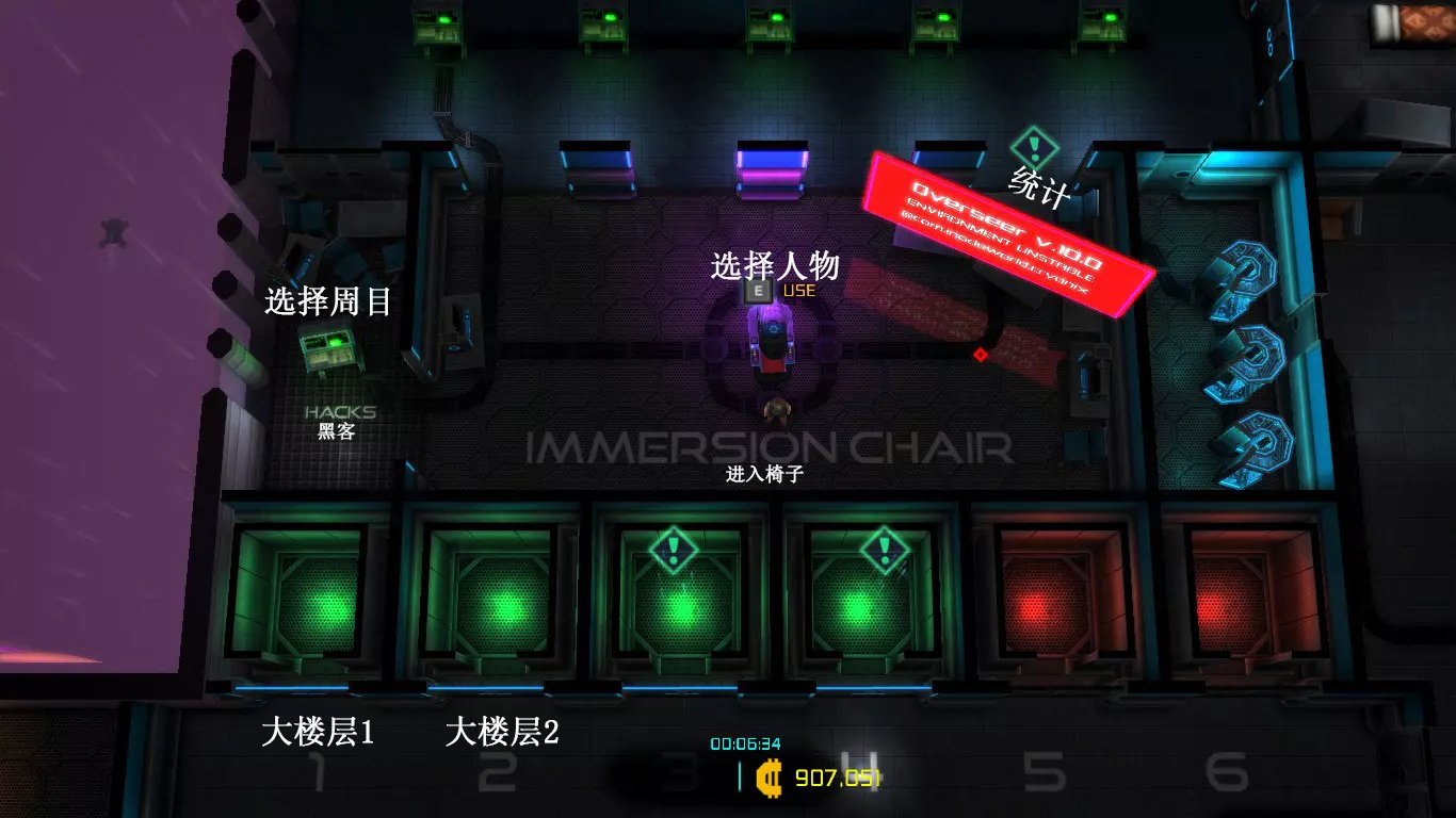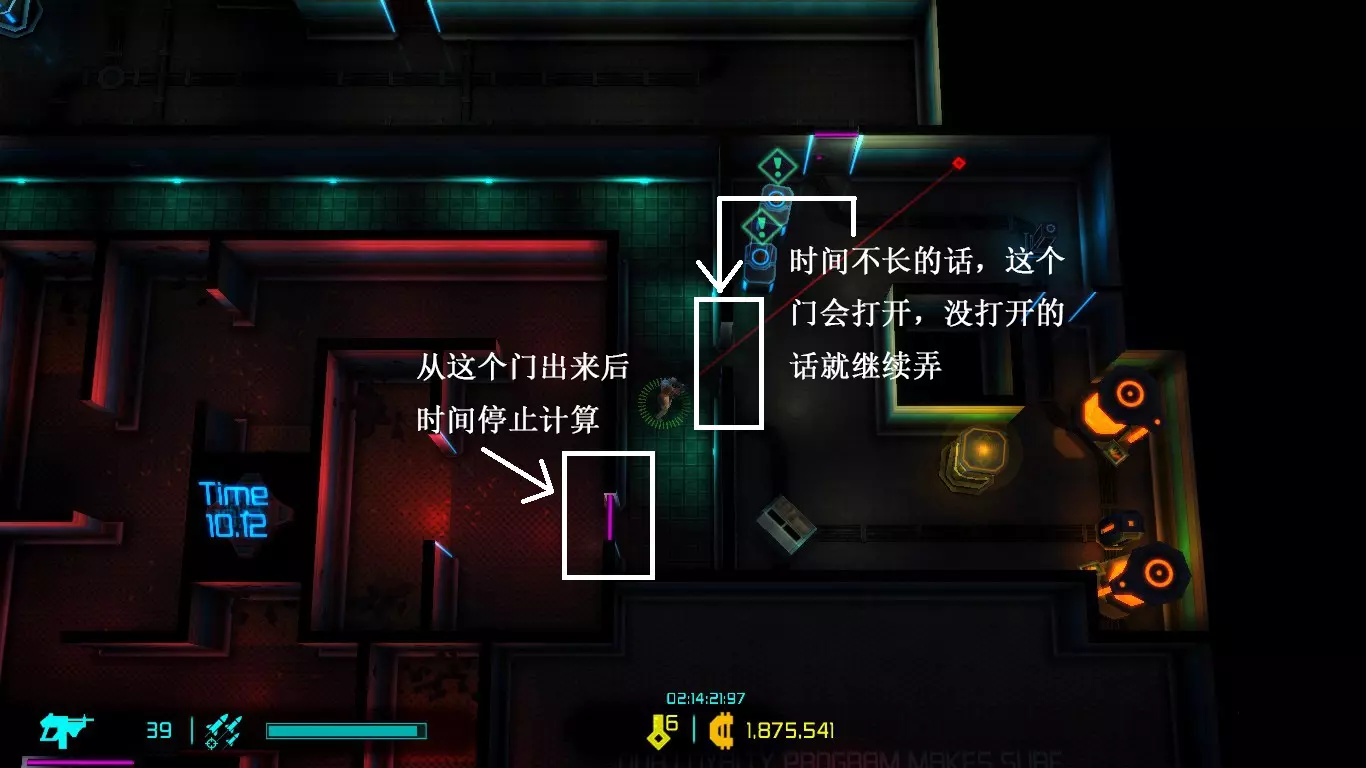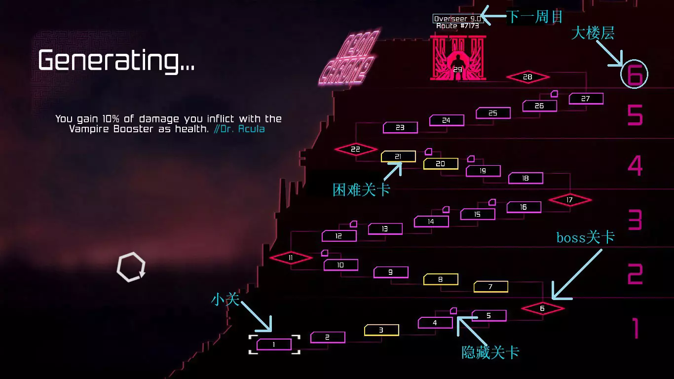 每次地图都是随机生成的,因此每次游玩的关卡大多与上次不同(但玩多了还是会遇到重复关卡)。隐藏关卡也不固定,若想刷取隐藏武器、技能或被动,需要一定的运气。 每次游戏可自行选择进入已通关的大楼层(前提是已击败该楼层之前的BOSS关卡)。 BOSS关卡是固定的:第一个是机械蜘蛛,第二个是蜈蚣,第三个是悬浮坦克,第四个是加长版蜈蚣或3个机械蜘蛛,第五个是监督者。 困难关卡会出现一群强化敌人或两倍援军等情况,这类关卡可以快速通过,无需战斗。 两个关卡之间若有隐藏关卡标识,前一个关卡即可进入隐藏关卡(例如图中4、5小关之间有隐藏关卡标识,那么在4小关就能进入)。 查看状态(按ESC键)。