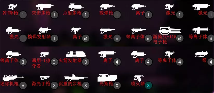 特殊属性:离子枪械对机械敌人多造成30%伤害;等离子体枪械对生物敌人多造成30%伤害;榴弹发射器拥有溅射伤害(爆炸);游骑兵-115电子枪射击能穿透敌人和墙(狙击枪);通用1-掠夺者是半自动步枪(点一下打一发子弹,枪的伤害还行,不想手累的话就不要用这把枪);火箭发射器拥有溅射伤害(爆炸);弩使用爆炸箭矢(爆炸);迷你机枪拥有旋转时刻(需要一段时间旋转枪管,这时就开始减慢角色的移速,然后就会以极快的速度将子弹都发射出去);激光手枪拥有隐藏属性移动速度+10%;沉重的步枪是半自动步枪,可以穿透敌人(狙)。高斯枪射击能穿透敌人和墙壁(狙击枪),有充电时间(每次连续射击前需要时间充电蓄能);喷火器对生物敌人多造成30%伤害,隐藏属性是攻击距离特别短(适合正面与敌人硬刚的枪械,但硬刚时自身容易死亡)。有的枪有隐藏属性【移动速度-10%】,(沉重的步枪、高斯枪、迷你机枪等)(其他的我不记得了,但普通枪械不会减移速) 使用不同的枪有不同的打法: - 冲锋枪和突击步枪适合连续射击并冲入敌阵 - 点射步枪需要比拼手速 - 霰弹枪用于近距离攻击敌人 - 爆炸枪械要注意避免炸到自己 - 狙击枪可以从远处杀敌 - 机枪能够火力压制敌人 - 喷火器需要近身偷袭敌人 榴弹发射器、火箭发射器、弩都属于爆炸枪械,可以和【爆炸奖励】④配合,具体可查看被动技能说明。 游骑兵-115电子枪、沉重的步枪、高斯枪属于狙击枪,可用于完成成就10,详细内容请查看成就列表。