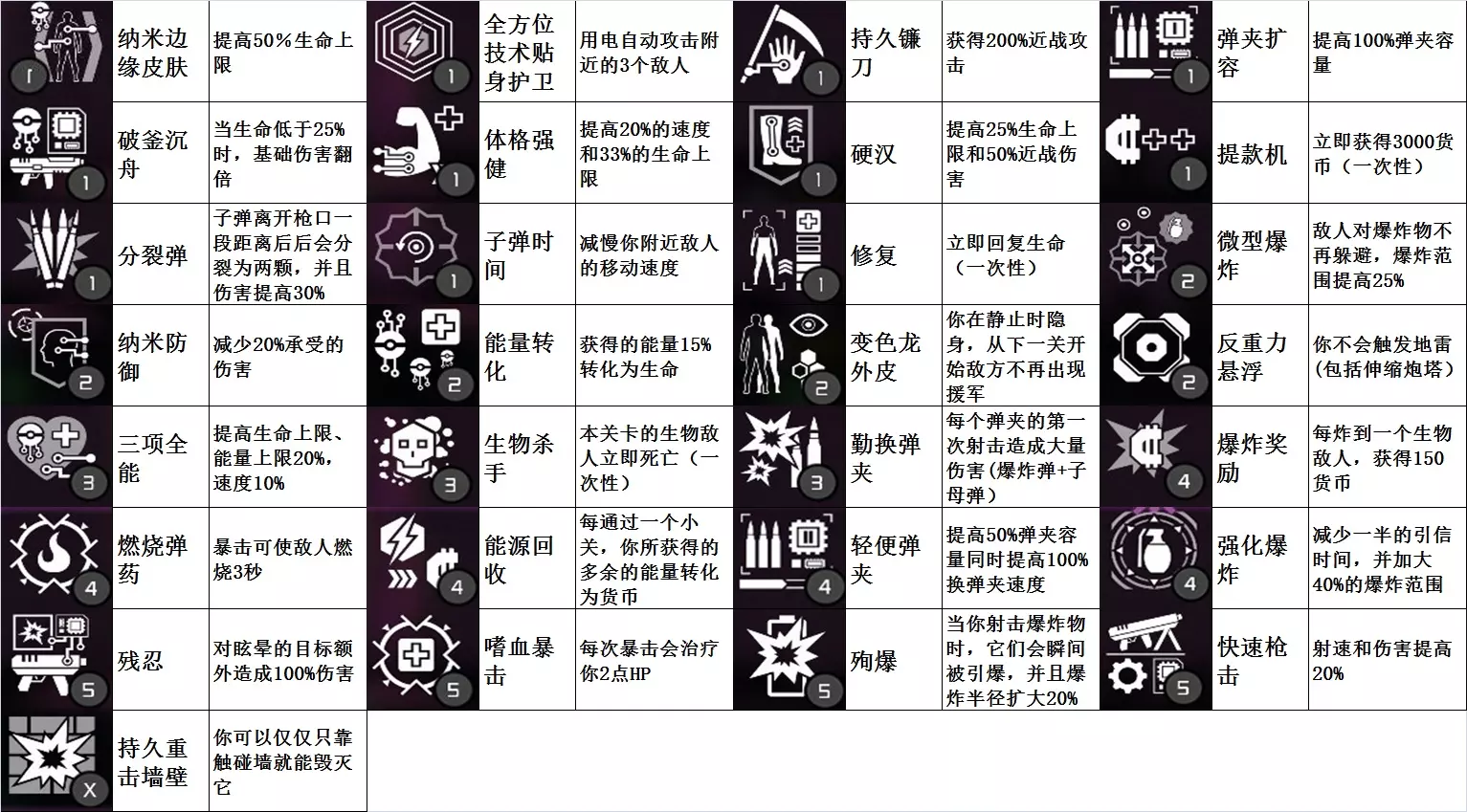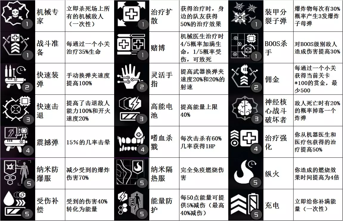 图片上被动的位置与游戏中商店里被动的位置一致,方便大家对比。 本来是打算一张图片搞定的,后来发现字会显得比较小,看起来很麻烦,就分成两张了。 每升一级插槽就可以多装备一个被动,而被动是这个游戏的精髓。 刷钱的被动:【提款机】①(一次3000);【爆炸奖励】④(每炸到一个生物敌人获得150);【佣金】②(每通过一个小关获得当前关卡*100,最少500);【能源回收】④(每通过一个小关,你所获得的多余能量转化为货币)。最先得到的被动一般是【提款机】,但只要插槽没满,或者自己身上较弱的被动能换成较好的,就不要选【提款机】;当【佣金】获得后,就可以去商店里花300购买,然后从第一小关往上面打,这是前期游戏的主要经济来源,假设楼层是28层,打通关大概可以赚38800;如果想用【爆炸奖励】赚钱,最好是购买【纳米防爆服】,再买爆炸型枪械、技能,然后再刷;【能源回收】我觉得没什么用,但聊胜于无。 防御的被动:【纳米防御】②(减少20%承受的伤害);【纳米防爆服】⑤(减少受到的爆炸伤害70%);【纳米隔热服】⑤(完全免疫燃烧伤害);【能量防护】⑤(每50点能量可提供5%减伤(最高40%减伤))。【纳米防御】比较实用,直接能减伤;【能量防护】需要能量作为支撑,能量耗尽后就无法减伤,但40%的减伤效果很强;【纳米防爆服】也比较实用,后期小怪和首领的爆炸伤害通常在400以上;【纳米隔热服】作用不大,除了燃烧桶,很少遇到造成燃烧伤害的敌人(部分精英敌人死亡后会掉落小型燃烧弹,但非常少见)。虽然有一些防御被动,但打怪仍需要灵活走位,或者卡怪的视野(盯着墙角打露头的小怪,小怪数量多的话就一边撤退,一边卡视野打,没有掩体的地方就走位) 提高生命上限的被动:【纳米皮肤边缘】①(提高50%生命上限);【体格强健】①(提高20%的速度和33%的生命上限);【硬汉】①(提高25%生命上限和50%近战伤害);【三项全能】③(提高生命上限、能量上限20%,速度10%)。除了【纳米皮肤边缘】,其他的都不是只增加生命上限,属性收益:速度>生命上限>能量上限>近战伤害,所以【体格强健】>【纳米皮肤边缘】=【三项全能】>【硬汉】 攻击BOSS的被动:【BOSS杀手】①(对BOSS级别敌人造成伤害提高30%);【分裂弹】①(子弹离开枪口一段距离后会分裂为两颗,并且伤害提高30%)。分裂弹是子弹往前一小段距离,然后左右分成两颗子弹的,使用【分裂弹】的话就不要使用狙击枪,重要的事情说三遍。攻击非首领敌人的被动:【震撼弹】④(15%的几率击晕);【燃烧弹药】④(暴击可使敌人燃烧3秒);【纵火】⑤(你造成的燃烧效果时间提高为4倍);【残忍】⑤(对眩晕的目标额外造成100%伤害);如果不用【震撼弹】,就不需要【残忍】;如果不用【燃烧弹药】或燃烧手榴弹、集束手榴弹,就没必要激活被动【纵火】。【震撼弹】对任何非首领敌人都有效,但概率固定为15%,因此使用【震撼弹】时最好搭配射速较快的枪械;敌人燃烧时有概率乱跑且不会攻击,生物敌人乱跑的概率远高于机械敌人,因此可认为【燃烧弹药】仅对生物敌人有效,【燃烧弹药】触发燃烧的概率与暴击相关,所以暴击越高、射速越快的枪械效果越好。后期建议必带【震撼弹】和【残忍】。强化枪械攻击的被动:【弹夹扩容】①(提高100%弹夹容量);【快速装弹】②(手动换弹夹速度提高100%);【灵活手指】②(提高武器换弹夹速度20%和20%的射速);【快速击退】③(提高了击退敌人能力100%和开火速度20%);【轻便弹夹】④(提高50%弹夹容量同时提高100%换弹夹速度);【快速枪击】⑤(射速和伤害提高20%)。【灵活手指】、【轻便弹夹】、【快速枪击】这三个特别实用。
