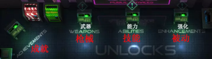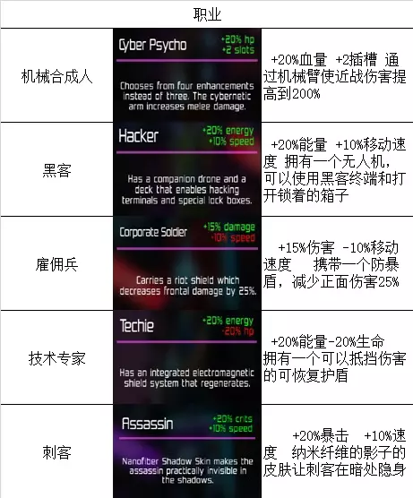 玩这游戏只选择黑客,刺客和机械合成人,黑客赚钱比别人快,机械合成人善于与敌人硬刚,刺客能通过隐身避开或偷袭敌人(刺客的隐身在近距离是无效的,范围自己玩两次就大概知道了)。后期一般只用机械合成人。忘了说,有些灯是可以打掉的,所以刺客的可玩性也比较高。 被动 左边的被动(前四列)