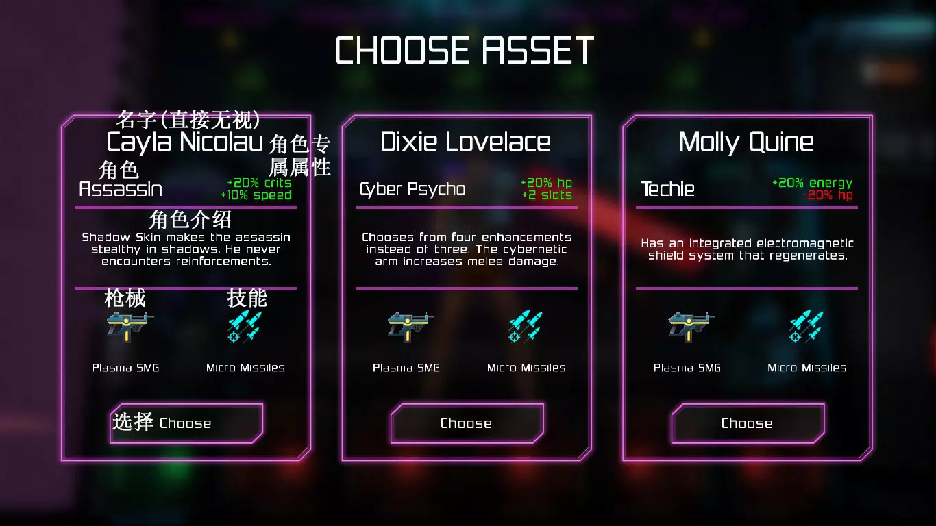 商店仅可购买已解锁的枪械、技能和被动,供下一局游戏使用。 游戏1.0版本时只能购买1个已拥有的被动供下一局使用,2.0版本可购买2个,以此类推(后续价格较高,若不想花费过多,购买3至5个即可); 枪械最低可购买5级的,且花费不多,通常每局都会购买一把带等级的枪,使开局时的总体枪械等级较高。若购买两把枪,第一把会被第二把替代,下一局游戏将只拥有购买的第二把枪; 技能可根据个人喜好购买,若购买两个技能,同样是第二个生效,第一个被替代。 完成成就后可在商店领取金钱。 选择人物: