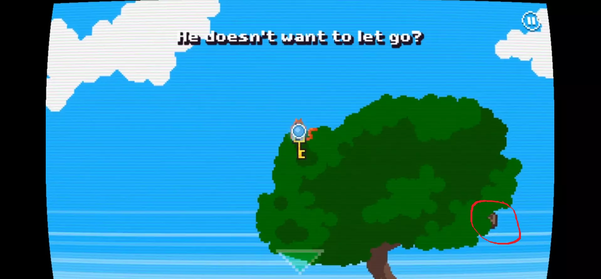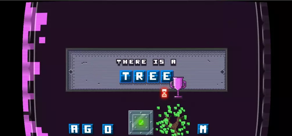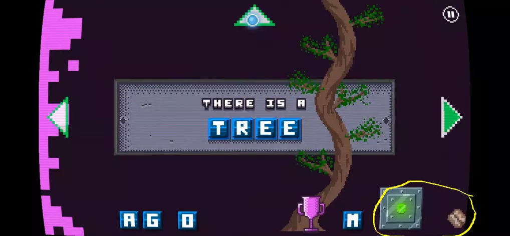 7) 拼出单词【TREE】,会出现一棵小树(见下方图片1)。拿起右侧(山羊所在位置)的杯子,装满水后倒在小树上(共三次),然后爬到树顶,点击坚果(见下方图片2红色圆圈处),坚果会掉到地上。下去后,用金属箱子砸碎坚果(见下方图片3)。坚果壳裂开后,回到树上把坚果给松鼠,它会丢下钥匙。下去捡起钥匙,向右走打开山羊笼子。
