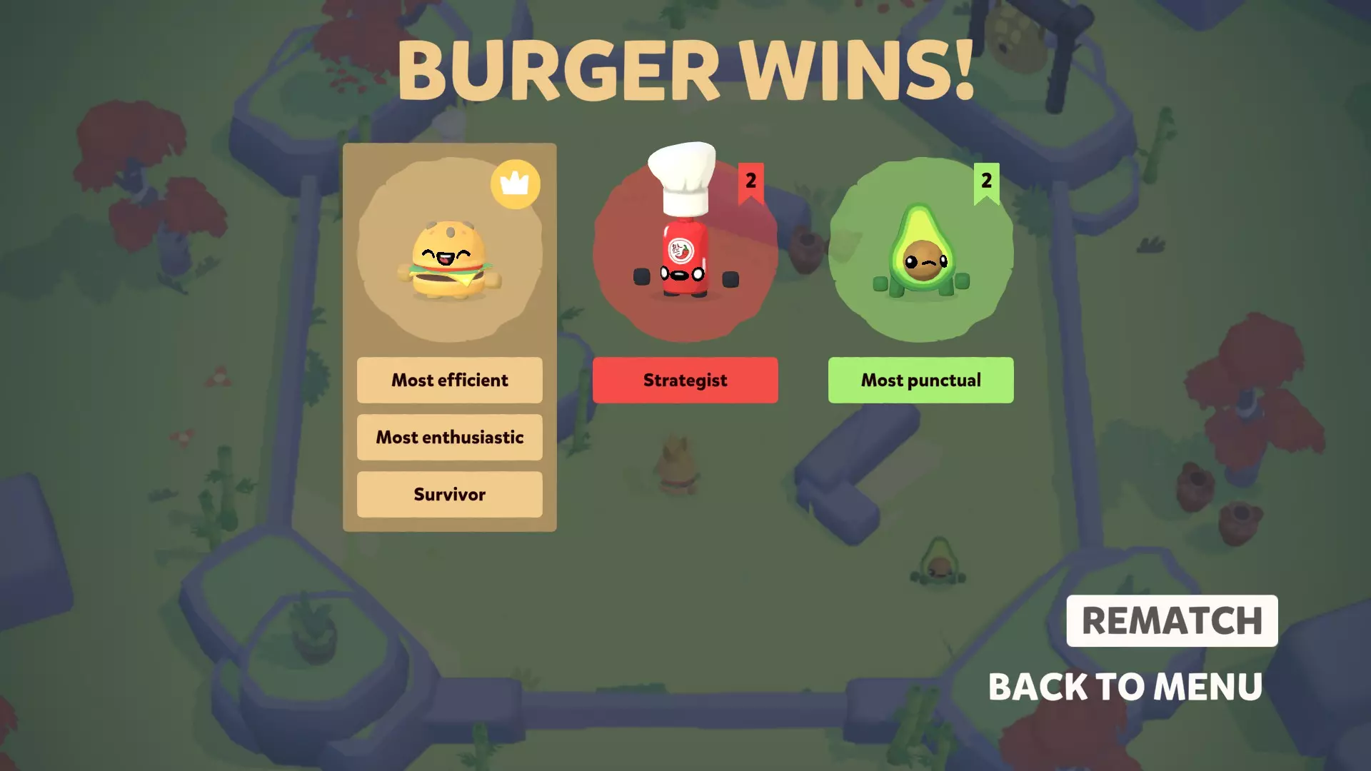 使用3个输入设备稳定获取【Punctuality】成就的指南 设置 我见过其他相关指南,但它们不像本指南这样简单直接。 准备3个角色,其中两个作为受害者,一个作为你主要操控的角色。 我将它们命名为: 主角色:汉堡 受害者2:塔巴斯科(辣酱) 受害者1:牛油果 游戏模式设为自由混战。 筛选掉除高亮地图外的所有地图,因为该地图是开放区域,没有陷阱,无法躲藏,不会掉出地图,且所有角色都处于较近位置。