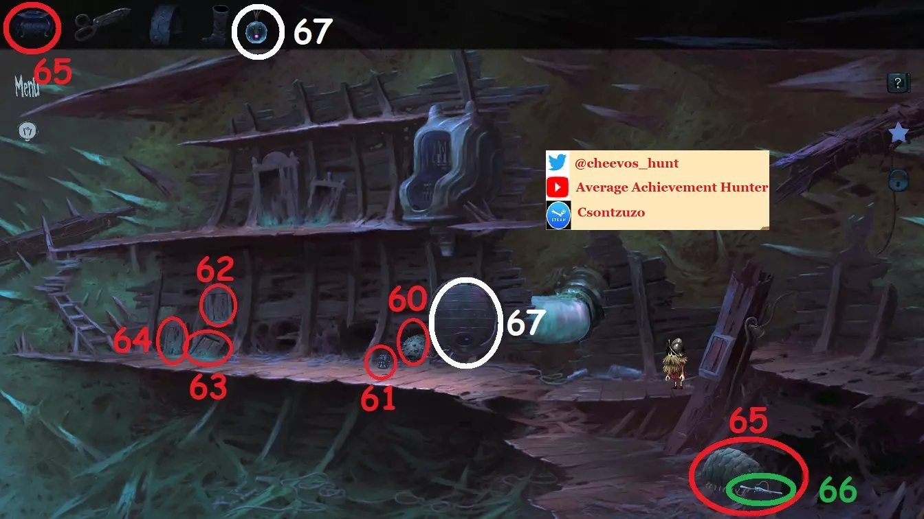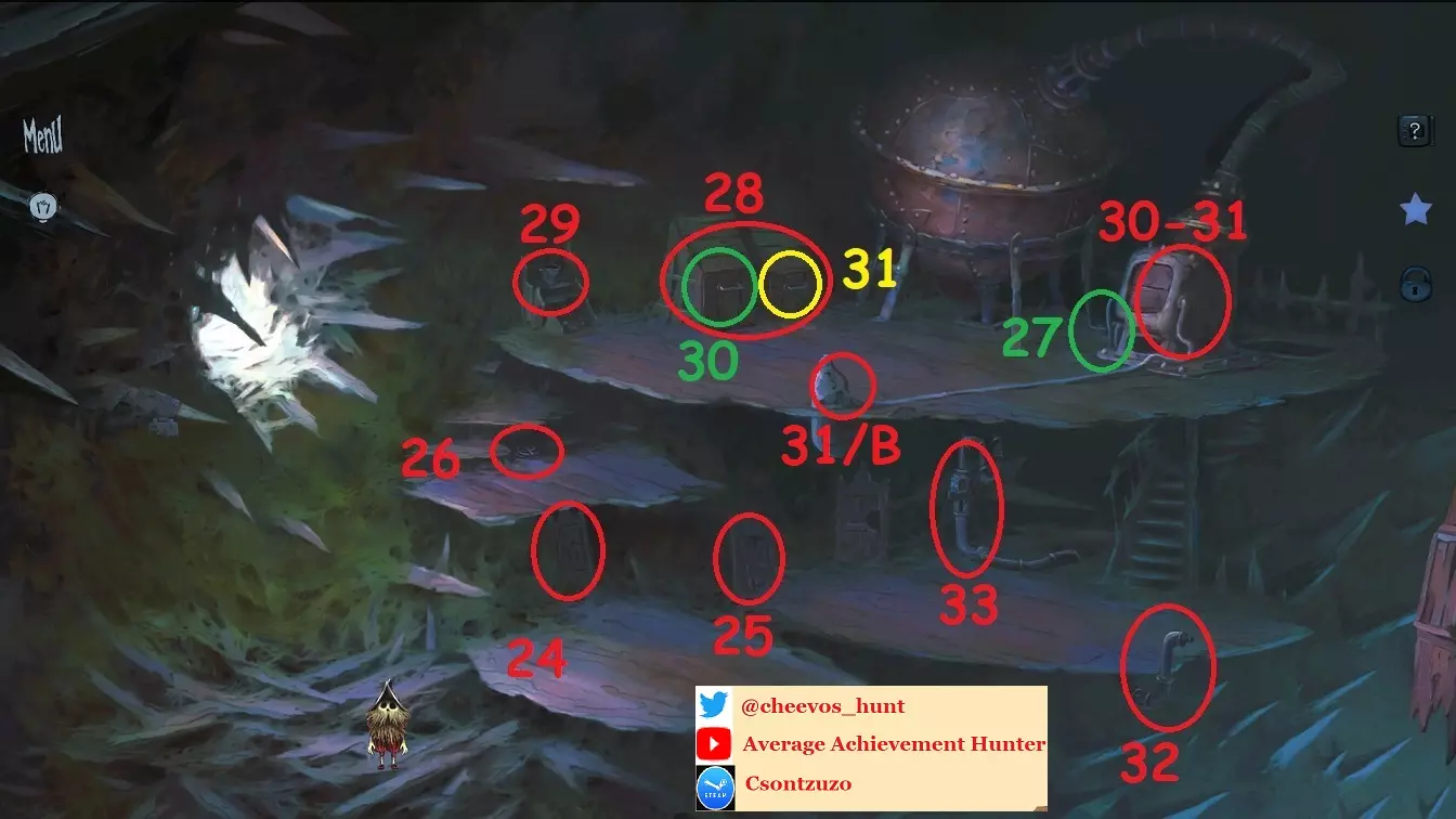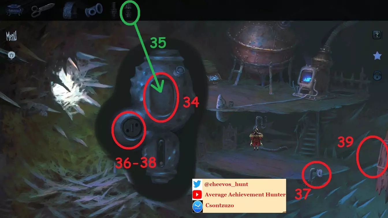 24:打开柜子并从中拿起【音乐盒】 25:打开柜子并从中拿起【T型接头】、【陷阱】、【医用剪刀】、【喷嘴1】和【喷嘴2】,共5个新物品 26:拿起【软管】 27:打开锅炉/燃烧器 28:打开两个木制储物箱 29:拿起【水桶】 30:用水桶盛取煤炭并向锅炉中添加一桶 31:用水桶盛取蓝色材料并向锅炉中添加一桶 31/B:与杠杆互动以启动锅炉