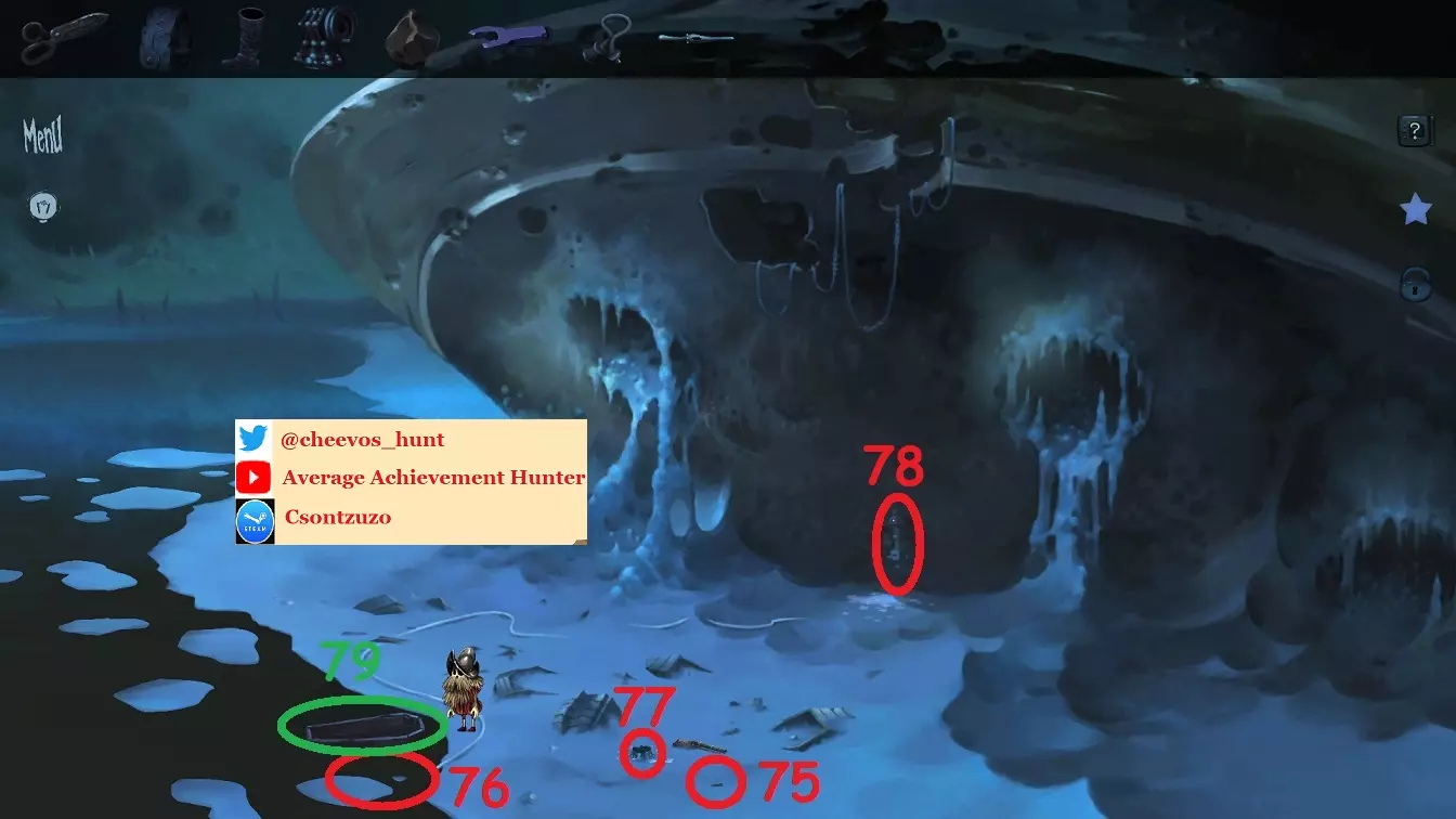 75:拿起【温度计】 76:在海里使用【靴子】以获得【装水的靴子】 77:在标记位置使用【装水的靴子】,同时你也会用到【温度计】 78:与控制台互动以获取【票】 79:使用【外星装置】返回城市(你总是需要用它来乘船旅行,之后不再赘述),然后前往【湖泊】