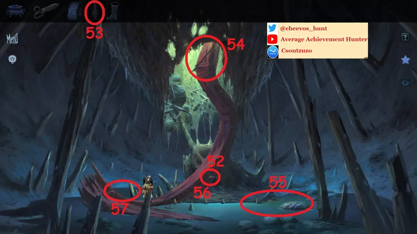 52:与管道互动两次将其打开 53:将物品栏中的【喷嘴】放入通过步骤52打开的窗口中,通过这种方式你实际上会拿起设备中原本的另一个【喷嘴】 54:标记为54的长矛现已掉落在地,与之互动以使用它捕捉外星动物 55:与外星动物互动一次将其从水中拉出,然后使用【医用剪刀】对其使用以获取【外星芯片】