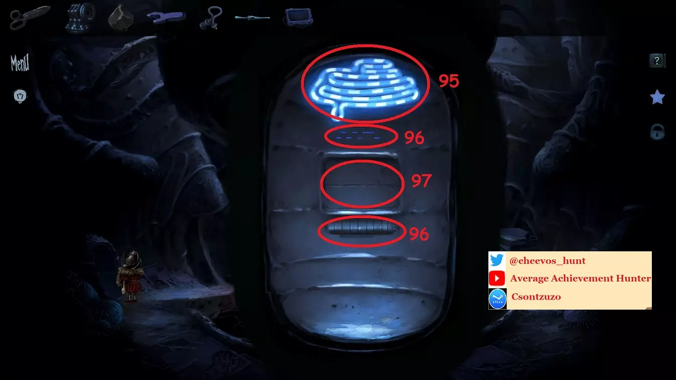 95:将【灯】放置在指定位置(图片中已放置),点击它两次以打开灯并查看谜题的解决方案 96:按下提示所指的按钮。解决方案:按下第1个、第3个、第5个和最后一个按钮 97:舱门现已打开,拿起【保险丝】 98:前往岛屿