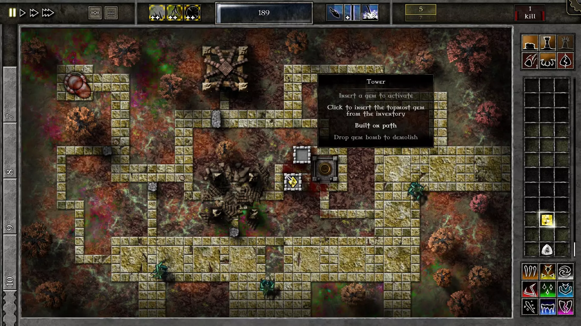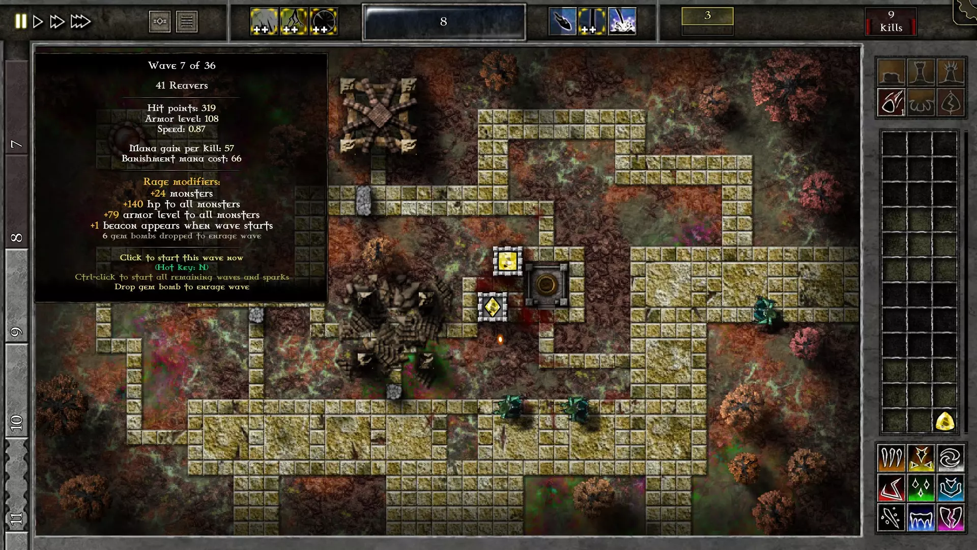下一步是建造另一座塔和杀戮宝石,以及一颗G1黄宝石来开始激怒波次。