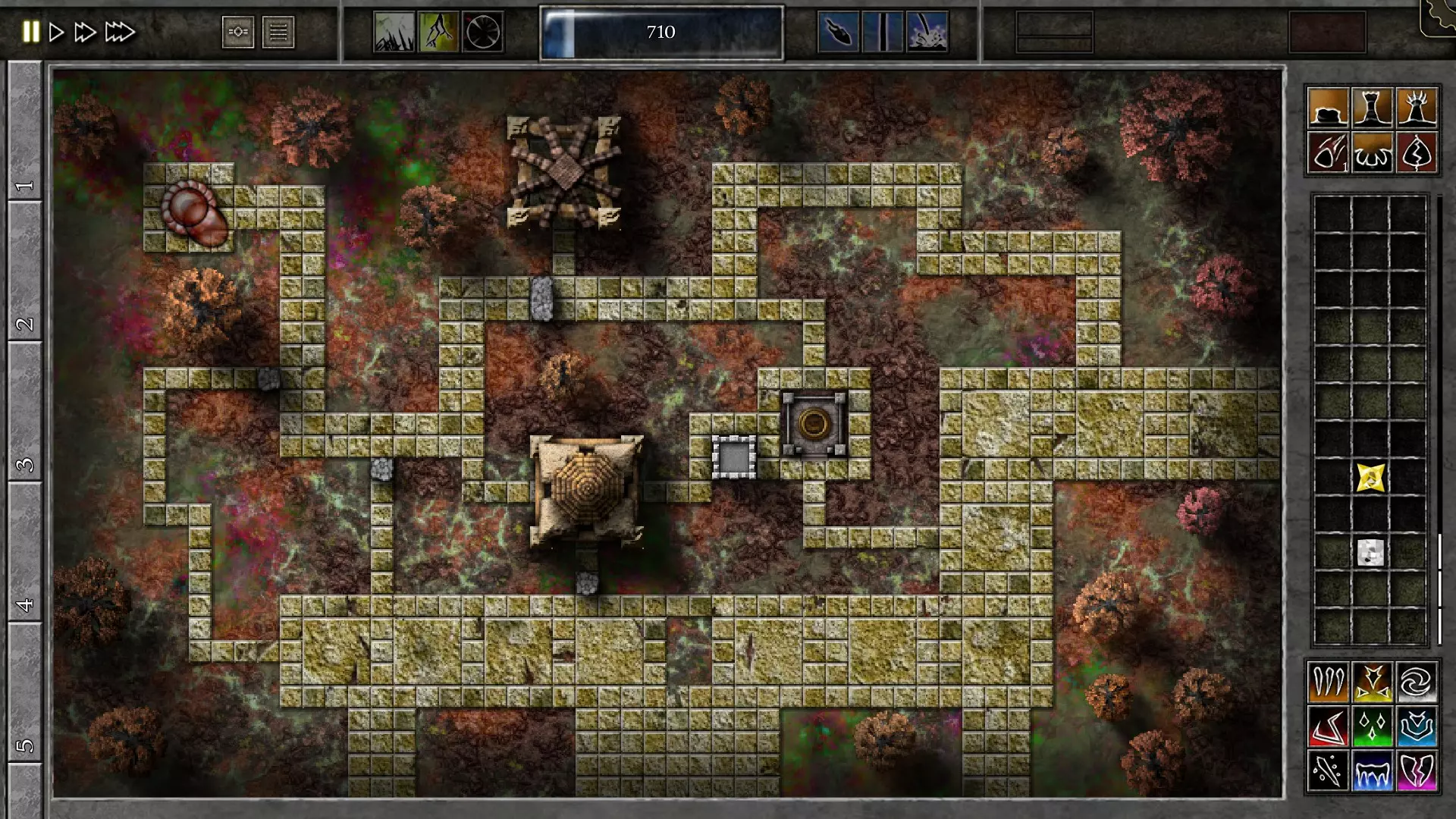 野外布阵 按照图示放置墙壁和一座塔。我们初始拥有一颗黄白色的杀戮宝石,目标是在第8波前摧毁巢穴。将两颗宝石合成一颗,然后开始战斗。