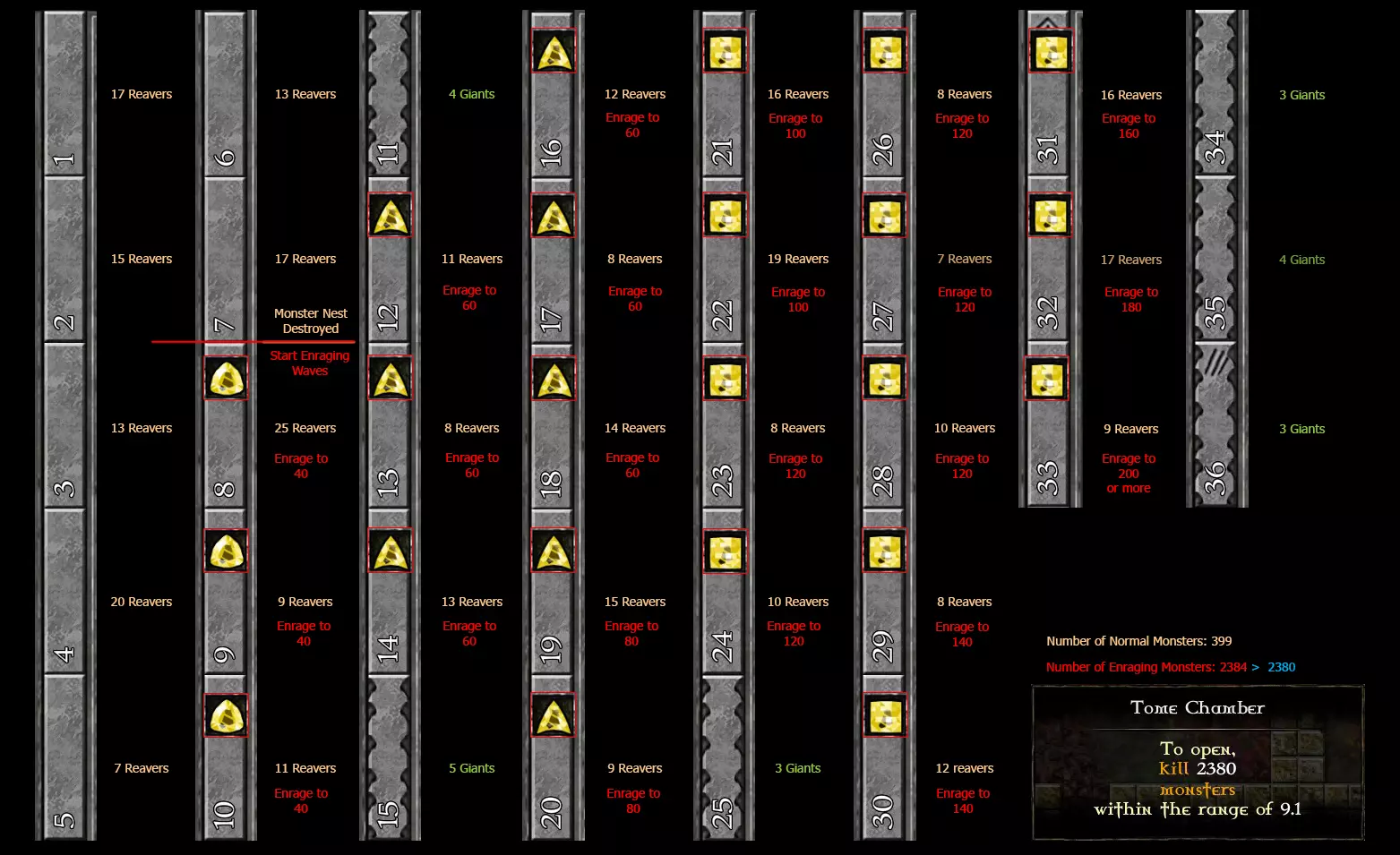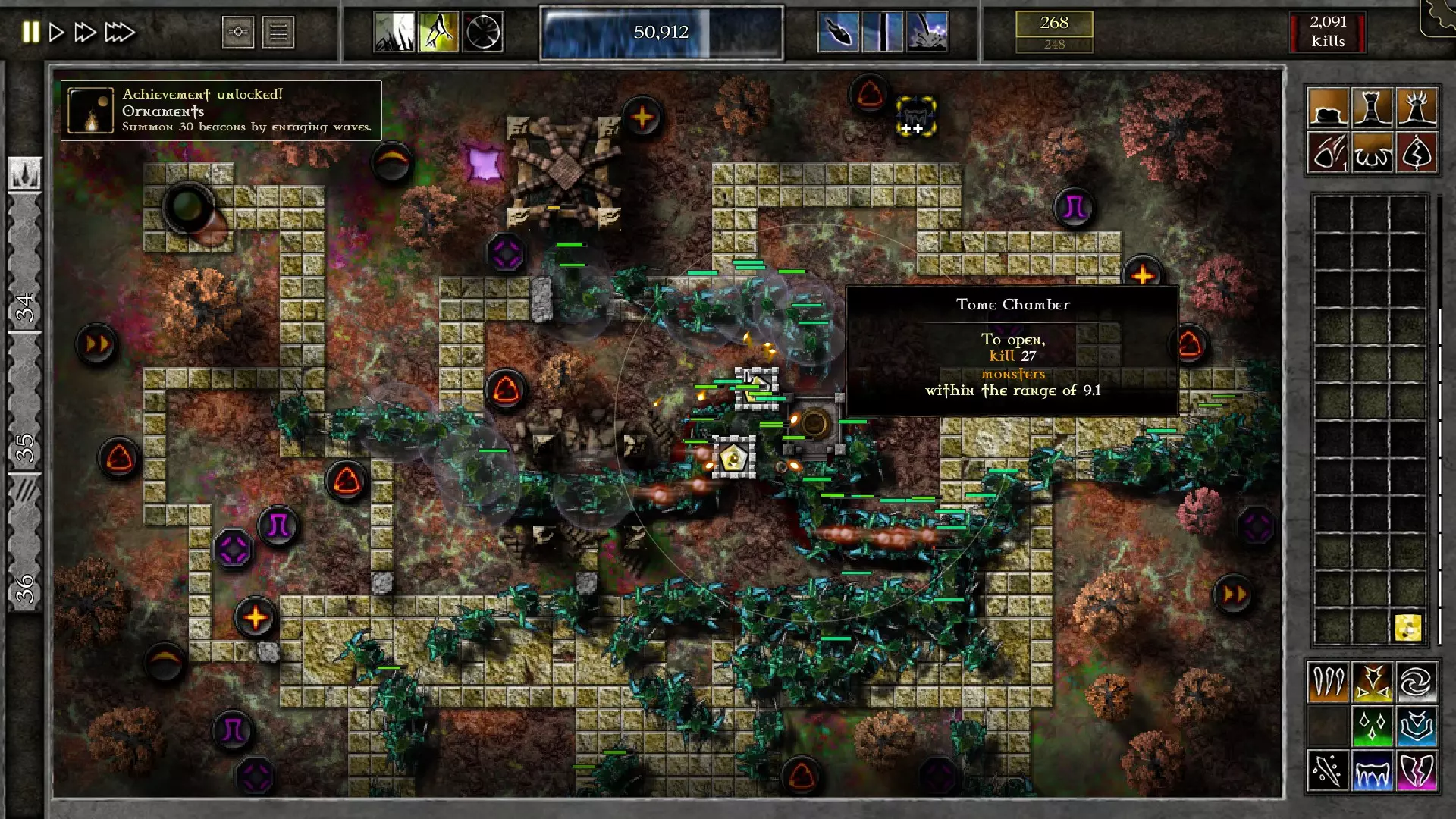 按照激怒波次的指南,你可以在【法典密室】区域击杀适量的怪物。务必做到: • 不要错过任何一次激怒波次 • 将魔力用于轰炸和升级宝石 • 检查宝石的范围,确保其始终处于法典密室的有效区域内 • 当大量怪物聚集在法典密室的效果范围内时,要时刻保持操作 • 使用冰冻法术,在紧急情况下使用“激光”光束 • 尽可能使用闪电术摧毁信标 如果在最后几波时发现还需要更多怪物……就增加轰炸次数以达成目标。如果你按照图片中建议的数字操作,就不会有问题。结果大概会是这样的。