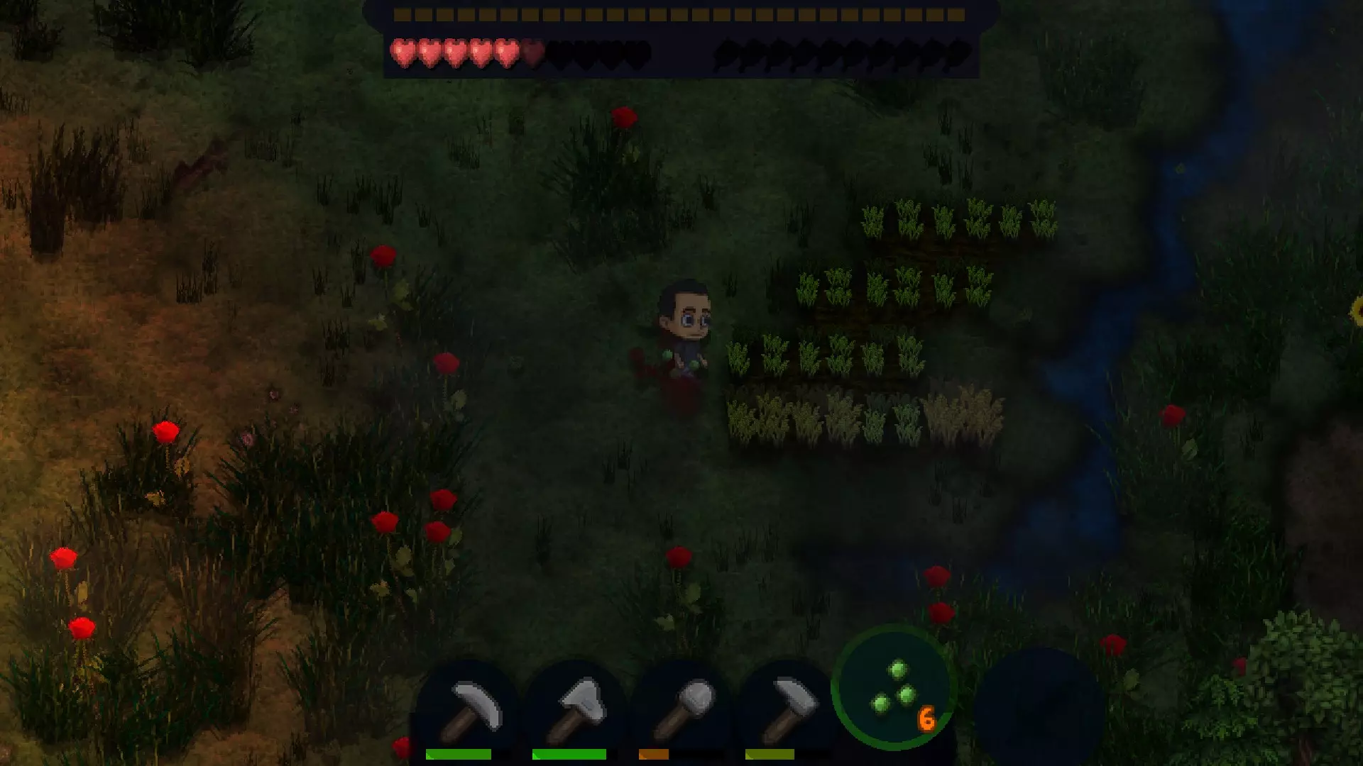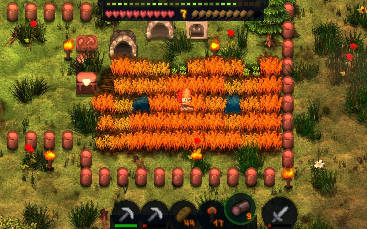 菜园 用锄头开垦一块5×5的格子地,然后在中间用铲子挖一个坑。制作水桶,在桶里装满水后倒入坑中。水会灌溉半径2格的范围。接着找到泥炭土,用铲子挖取,获得肥料。将肥料铺在菜园的每一个格子上。使用肥料后,我们能收获3份小麦;不使用肥料则收获2份。