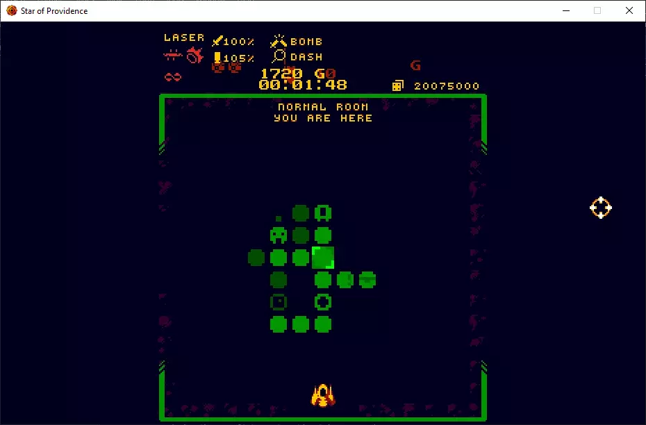 但这还不是你能获取的全部信息。如果你想更详细地了解自己的位置,可以按下地图键调出当前楼层的完整地图等信息。(你可以在战斗中使用地图,但这对击败敌人没有帮助。) 地图本身占据了此屏幕的大部分区域。起始房间始终位于楼层的正中央,因此可以作为你的导航锚点。已探索的房间显示为较亮的色调,已发现但未探索的房间则为较暗的色调。你当前所在的房间在地图上会被放大,以便在视觉上更易于区分。 在地图区域的顶部中央,会显示当前在地图上高亮的房间类型(例如“普通房间”“商店”等)。当你打开地图时,默认会显示你当前所在的房间,但你可以移动地图光标到其他房间查看它们的信息。只要不在战斗中,当你用光标在地图上高亮另一个房间并按下互动键(或用鼠标点击该房间),你就会立即传送到那里。我再重复一遍:非战斗状态下,你可以立即传送到本层已探索过的任何房间。这能极大节省时间,你无需缓慢穿越楼层到达另一端,只需直接传送即可。这让清理楼层的过程不再那么繁琐,也减少了你在途中撞上尖刺而受伤的几率。之前我说过,炸弹是用来开启捷径和秘密的。你偶尔会遇到部分墙壁有裂缝,并且在地图上会看到【镂空】的房间。这些就是捷径,你需要在有裂缝墙壁的房间使用炸弹才能进入。这些房间里可能有敌人和/或道具。你只需使用一次炸弹,之后就能随意进出这些房间了。 还有秘密,它们通常在地图上不可见,也没有明显的指示。秘密里通常有不错的战利品,每层只有一个,找到它们的最佳方法是查看地图。秘密通常与三个房间相邻,但有时也可能是四个或两个。仔细查看地图,就能发现它们可能藏在哪里。如果任何相连房间的连接墙壁上存在障碍物,那么隐藏房间就不可能出现在该位置。 不过,屏幕顶部还有更多信息。从左侧开始,向下查看,然后向右移动,你会看到: 【当前武器类型】,如果是独特武器,则显示其名称。 在其下方,如果装备了武器,会显示当前武器的关键词符号。 关键词符号右侧是【伤害值】。这是一个全局属性,会对所有造成的伤害进行倍率计算,因此即使切换武器也会保留。初始值为100%。 【最大弹药量】。这是另一个全局属性,会对所有拾取武器的最大弹药量进行倍率计算。初始值为100%。最大弹药值越高,从拾取物获得的弹药也会越多,因为这些弹药是基于百分比计算的。 如果你持有武器,屏幕上会显示【按炸弹键销毁你的武器】。这是一个不常用的操作,仅在极少数情况下有用,但为了以防万一还是保留了这个功能。通常建议不要这样做,注意不要误操作! 在其下方,还有文字显示【按冲刺键获取详细信息】。这是一个你可以访问的二级信息界面,稍后我会进行说明。 再往下是本局得分,等于本局获得的金钱数量。这里指的是获得的金钱,而非花费或剩余的金钱。 最下方是本局计时器,显示你在本局游戏中已花费的时间。暂停游戏会使计时器停止。最后,在最右侧,你能看到当前游戏局的种子。种子是游戏的一项功能,其相关内容不在本手册的介绍范围内。