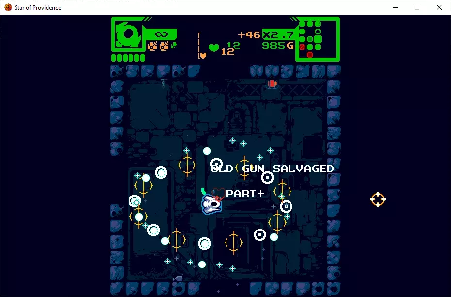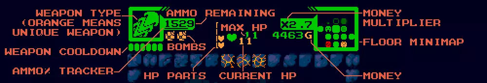 游戏内的HUD界面能帮助你追踪自身状态和资源,并且始终可见,让你能快速浏览所有信息。充分利用它提供的信息,尤其是在查看商店和升级时! 以下是HUD元素的详细说明,从左侧开始,向下查看,然后再看右侧。我会借此机会给出一些简短提示。一开始可能很难记住所有内容,但玩得越多就越能熟练掌握。 左上角显示的是你的武器类型。这里会显示你当前使用的是火球、激光还是豌豆射手。如果图标为橙色,则表示该武器是独特武器。 其下方是武器冷却计量条。这具体含义取决于武器。有时它显示的是重新装弹前剩余的射击次数,有时是装弹计时器,有时则表示充能等级。这是与具体情境相关的,可能需要一些时间才能凭直觉理解它在每种武器上的作用方式。 与武器类型框相连的是弹药数量显示,你可以看到枪支剩余的射击次数。要记住,射击的威力和数量取决于枪支本身,因此某把枪有500发子弹可能算少的,而另一把枪有75发可能就算多的了。 其正下方是弹药百分比指示器,它能让你大致了解当前弹药量占最大弹药量的百分比。有些枪支的最大弹药量为80发,而另一些则为1800发,所以你不能仅依靠上面的数字来判断弹药的剩余情况。这条细线能让你知道剩余弹药是95%还是15%。 细线下方是你的炸弹。初始有2个,最多可拥有6个。普通炸弹为纯色,而威力炸弹则会以独特的颜色或图标突出显示。 右侧是HP碎片。集齐4个HP碎片,你的最大HP和当前HP都会增加1点。不会浪费任何治疗效果,这有助于你追踪距离下次HP提升还有多近。 HP碎片旁边是两个数字。上方的是最大HP,下方的是当前HP。当前HP越低,HUD会从健康的绿色变为紧张的橙色,然后变为恐慌的红色,并伴有闪烁和抖动。 再往右是金钱倍率。初始倍率为最低的1,最高可提升至3。保持较高的【无伤击杀敌人】状态会让你获得大量金钱。 其下方是你当前拥有的金钱,这个非常直观。 右上角有一个小地图,显示你当前所在的房间以及附近的房间。当你进入一个房间时,小地图会预览相邻房间的信息,包括它们是否是商店、小Boss房间、升级终端等。不要低估这些信息的价值!你可以据此做出下一步行动的明智决定。 地图与信息界面