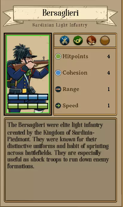 【坚韧】特性允许你穿越其他单位无法通过的地形而不会陷入困境,例如河流和森林。 本指南并非由专业人士制作。我只是在朋友圈中游戏水平高于平均的玩家,并且是意大利、英国、普鲁士和俄罗斯帝国的忠实玩家。请允许本指南存在一些错误,若有人指出,我会尝试进行修改。 目录 以下将包含各章节及其内容。第一章:1200分荣耀时代配置与意大利阵营解析 意大利阵营解析 意大利是《火力与机动》中的一个阵营,其依赖民族主义从山区征召大量兵员。这意味着许多单位都具备特殊特性。机动方面暂不展开,因为多数国家都拥有这一能力,且并非执行意大利高级战术所必需。本指南后续会提供一些关于机动的信息。这些特性的例子包括前面提到的【游击】和【坚韧】,以及【冲击】和【近战训练】。